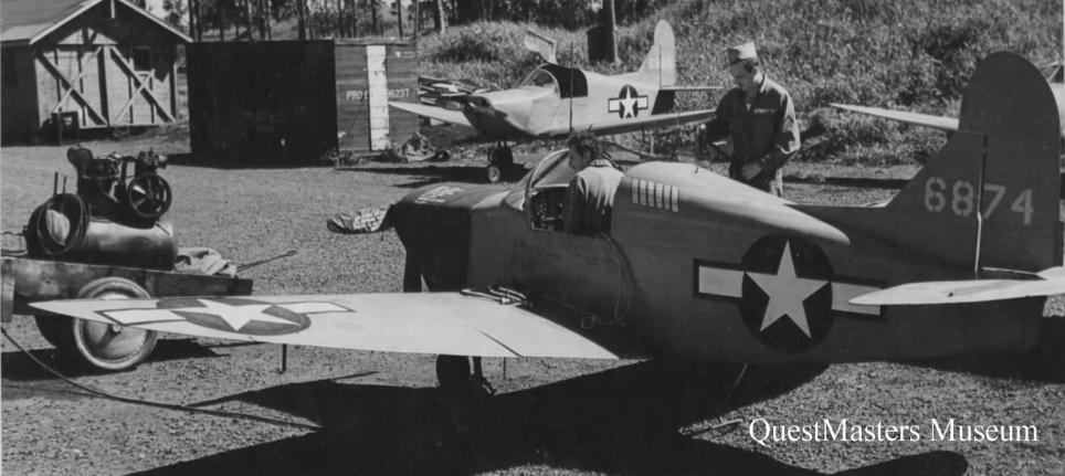 | U.S. Army Culver PQ-14 "Cadet" Target Drone Aircraft, engine oil pan, above top photo. This U.S. Army Culver PQ-14 "Cadet" Target Drone Aircraft engine oil pan was recovered by QuestMasters in 1995 on Oahu, Hawaii. The nomenclature plate is marked: AIRCRAFT FRANKLIN ENGINE, AAF; MANUFACTURER NUMBER O-300-11; AAF OR BUREAU NO. (blank); CONTRACT NO. W33-038AC1078; MFR NO 5-5202?3. The PQ-14 Target Drone that this engine oil pan came from as assigned to the 17th Tow Target Squadron, Wheeler Field 1944-1945. U.S. Army PQ-8 Target Drones, above photo. This Army Air Force photo, 63309A.C., War Theatre #22, Oahu, Hawaii, via National Archives College Park, Maryland, shows several PQ-8's being maintained at Wheeler Field, Oahu, Hawaii, April 1944. |
