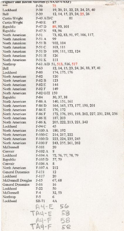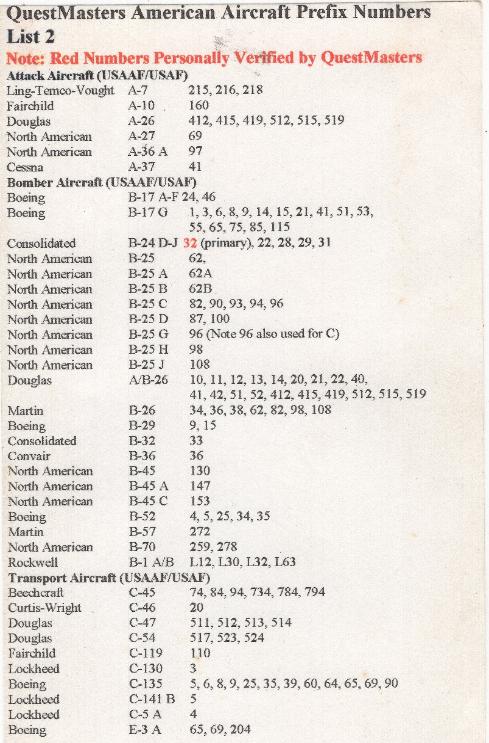 | QuestMasters started doing aircraft archeology work in 1993. Since then, many resources have become available online and can now be accessed remotely. The following five typed pages are the original reference material, compiled by QuestMasters between 1993 and 1996, and are shown here as historical reference. These pages are shown for reference only, errors may be present. Aircraft prefix number history: during and prior to WWII, aircraft manufacturers marked each part of an aircraft for assembly and part replacement. This coding system can be used to help identify aircraft parts when they are not installed in a larger assembly. How does this work? For example, the B-24 "Liberator" bomber was produced by the Consolidated Aircraft Company as the Model 32 aircraft and then designated the B-24 by the United States Army. Most parts on the B-24 have the aircraft part prefix number 32. This applies to many military aircraft manufacturers and the following pages may assist researchers on aircraft part or crash site identification. |
