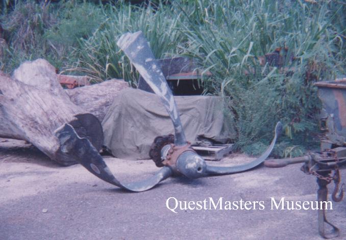 | U.S. Navy F-4U "Corsair" Fighter, aircraft propeller assembly, above photo. This WWII U.S. Navy F-4U "Corsair" fighter aircraft propeller assembly was previously removed from an aircraft that had a ground strike, as evident from the broken propeller tips and bent blades. The assembly was found, as shown, from a dump site on Kaneohe Bay NAS, Oahu Hawaii, in 1994, and recovered and later sold. |