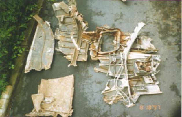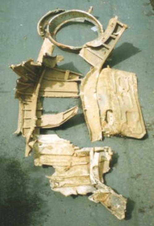 This is the starboard nose section of this B-24J (frames 0.1 to 0.3). This is where 2nd Lt. Charles E. Mueller and 2nd Lt. Morris Righthand lost their lives. The severity of the crash can be clearly seen. The fragment to the extreme left is the front frame (0.1) for entry into the nose turret (missing door). The fragment in the extreme bottom of the photo is the armored plate with B-7 mount for the Norden Bombsight. The C-1 Bombsight Stabilizer was recovered from the crash site, but the Bombsight was missing. On the outside of the aircraft skin is the hand painted Consolidated build number 4268. |