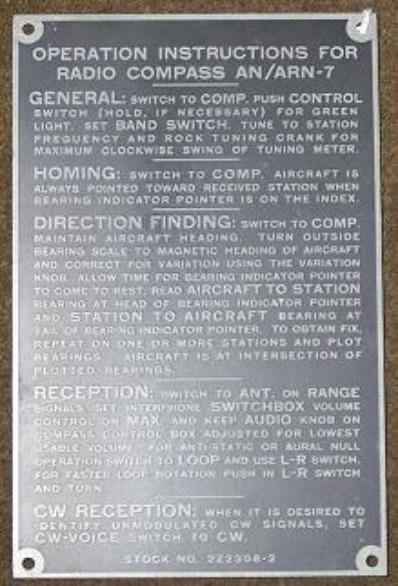 Six Type Q-1B Heated Flight Suit Rheostat, above left photo. Only two Q-1B's would be used in the cockpit, the other four will be used in other areas of the B-24 during this restoration. Operating Instructions For AN/ARN-7 Radio Plate, above right photo. This plate was located next to the BC-450 Radio Control Box mounted on the cockpit enclosure center frame. |