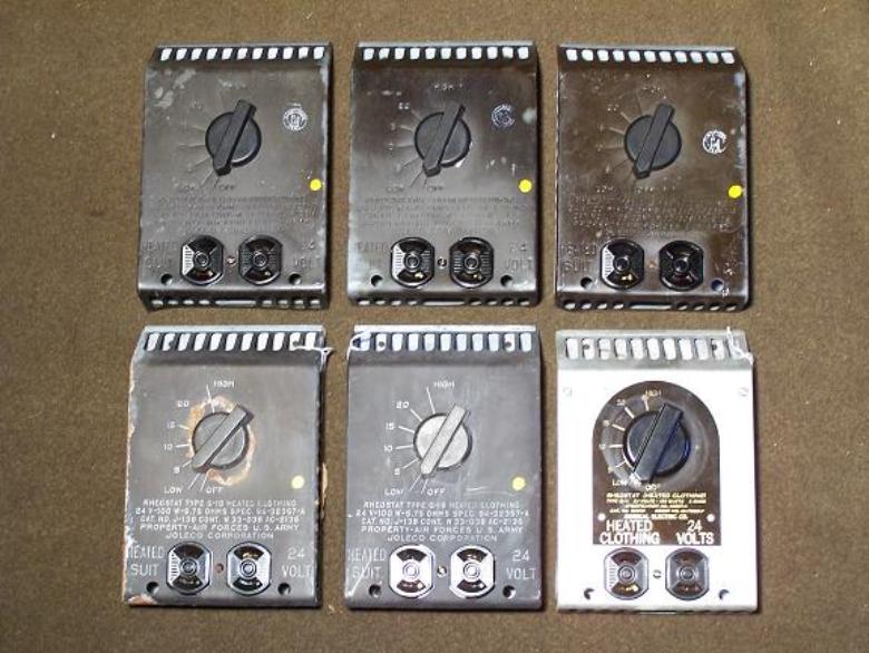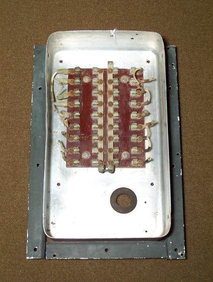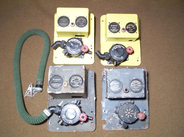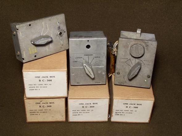 Four Oxygen Regulator Mounts, above left photo. Each mount contained one Type A-12 or A-12A Oxygen Regulator, AN 6021-1 Oxygen Pressure Gage and AN 6029-1 Oxygen Flow Indicator. One mount was located on either side of the Pilot and Co-Pilot. Seven BC-366 Radio Jack Boxes, above right photo. The BC-366 Jack Box was used to connect the microphone and headset to the radio system. Only two BC-366 Jack Boxes would have been used in the B-24 cockpit. The other five will be used in other areas of the B-24 during this restoration. |