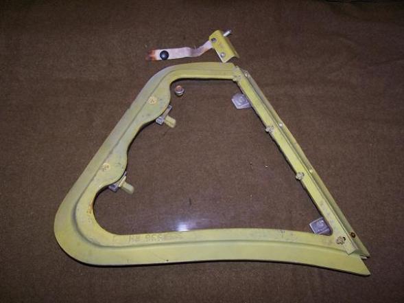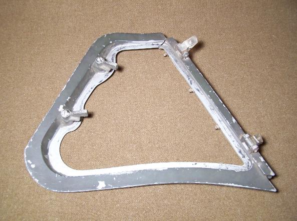 Pilot cockpit enclosure vent window, missing plexiglass, left photo. Shown from inside of window. Co-Pilot cockpit enclosure vent window, right photo. Shown from outside of window. |