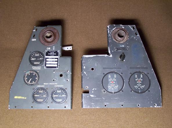 Pilot (left) and Co-Pilot (right) Auxiliary Instrument Panels, left photo. Pilots Instrument Panel: (3) Type E-4 Hydraulic Pressure Gages, (1) AN-G-24 Suction Gage and Pilot vent. Co-Pilot Instrument Panel: (2) AN-5795-6 Carburetor Gages and Co-Pilot Vent. Right photo, Top Row (L to R): Radio Compass Control Indicator with mount (used only on early B-24's), Turbo Boost Selector, Radio Compass and Mount. Bottom Row (L to R) Engine Switch Panel - Starter and Primer Switches (Co-Pilot side of cockpit), BC-451 Command Radio Control Box (mounted on Pedestal Assembly), Fast Feathering Switch for No. 4 Engine, and switch from Pedestal Mount. |