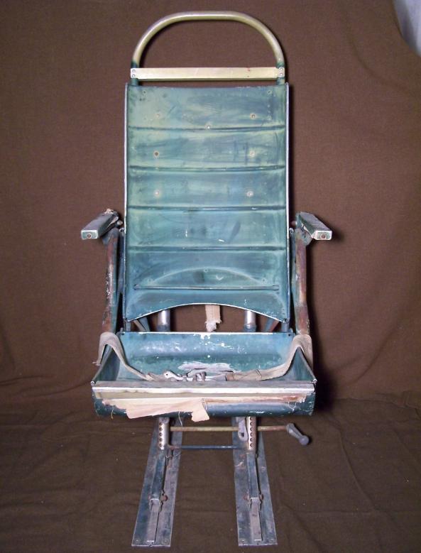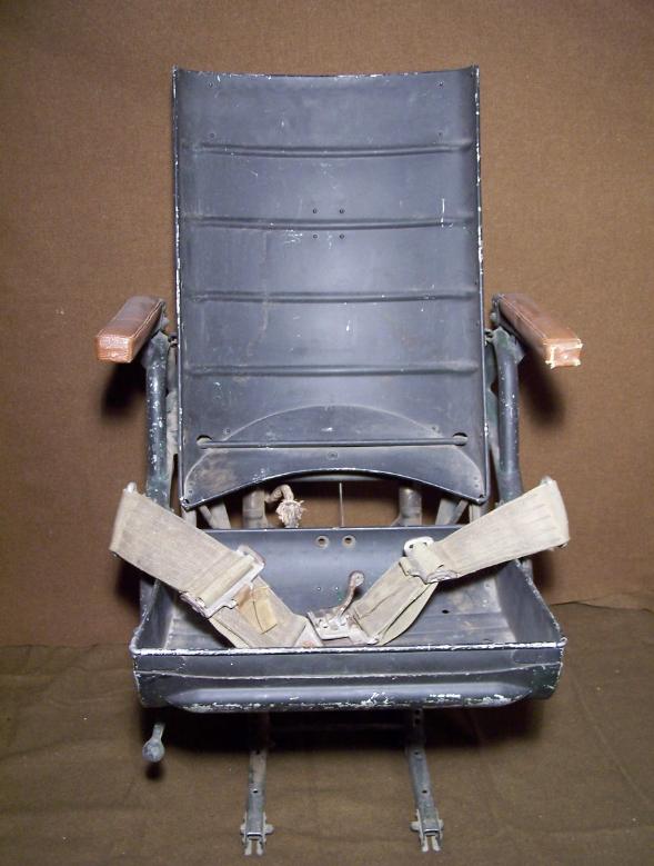 Pilot Seat, above left photo. Pilot Seat is missing head rest, head rest cushion, back cushion, seat cushion and complete knee pad and support. Co-Pilot Seat, above right photo. Complete with floor track attached. Missing head rest cushion, back rest cushion, seat cushion, arm rest upholstery and knee pad upholstery. |