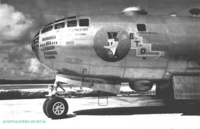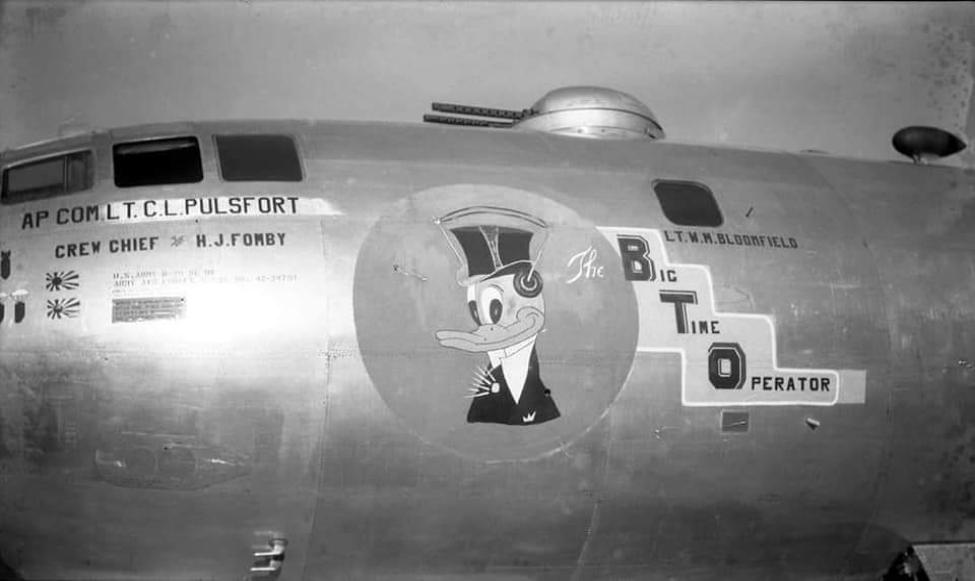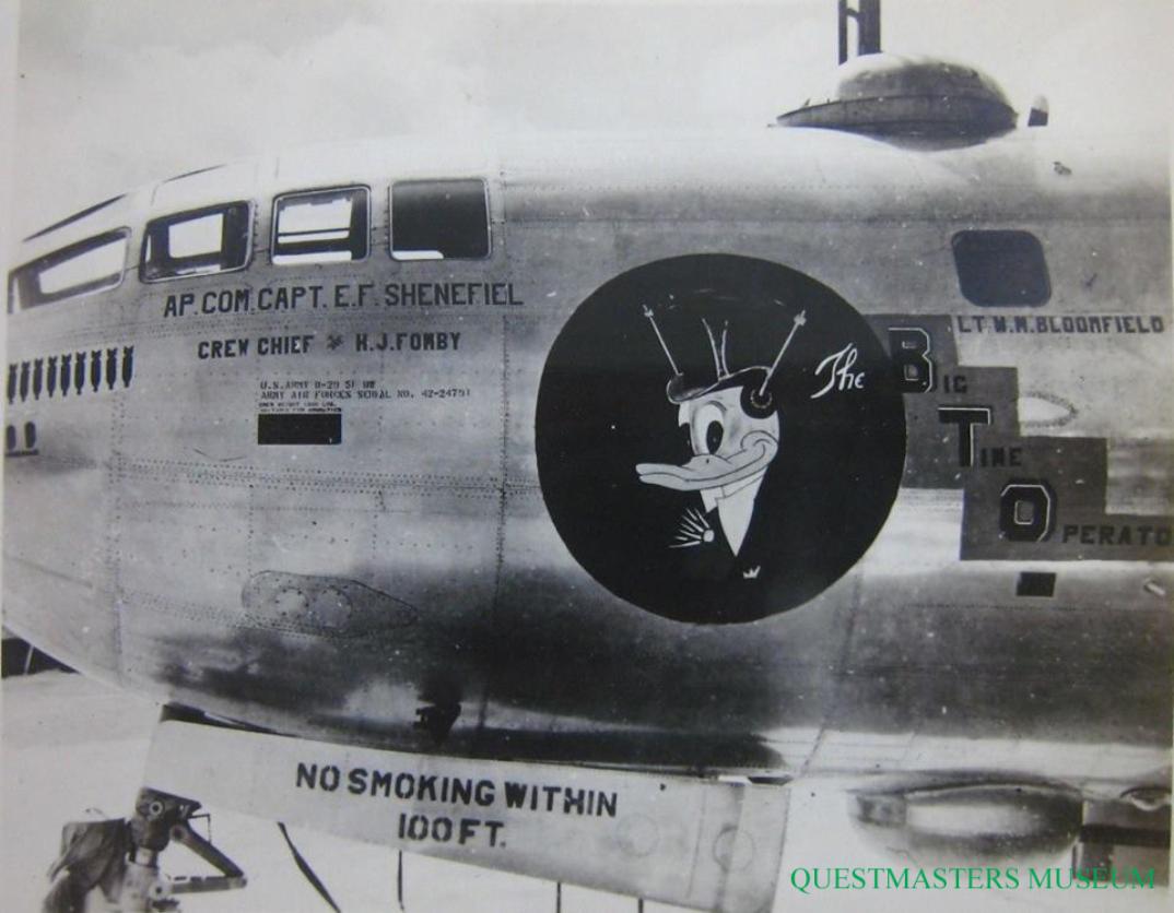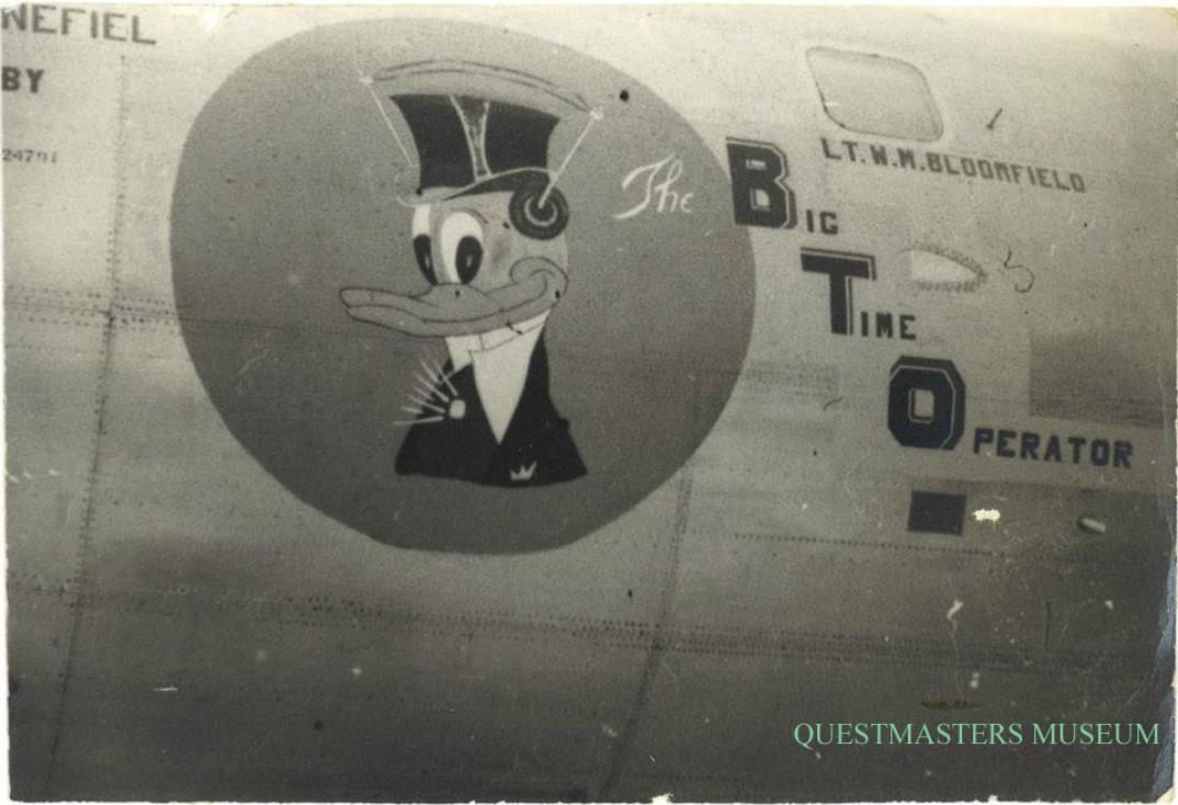 B-29-50-BW 42-24791 "The Big Time Operator", above. In this photo, the Air Plane Commander Captain E.F. Shenefiel, is painted under the Pilot window. Shenefiel flew 21 missions in the BTO. The Navigator is Lieutenant W.M. Bloomfield. The blue field for the name "The Big Time Operator" has not been outlined in white in this picture. |