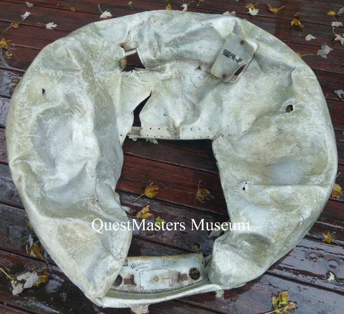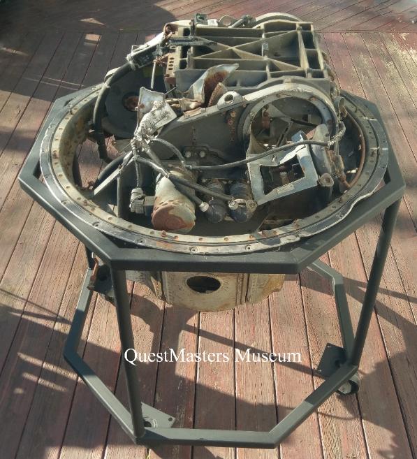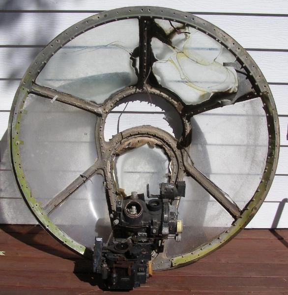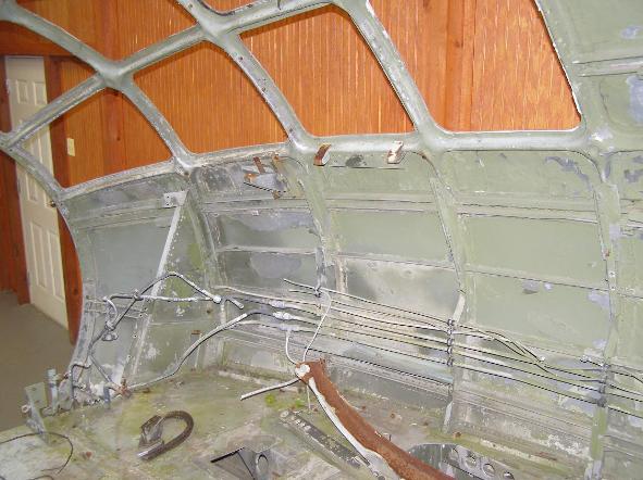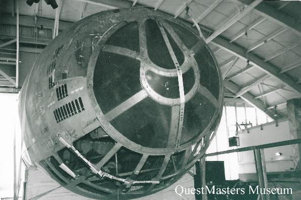 B-29 Cockpit nose "greenhouse", above photo. This cockpit greenhouse was found by QuestMasters in Omaha, Nebraska in 2012. The window glass is original. The top two sections are laminated glass. The bottom and center six sections of window are very thick plexi-glass. The M-9 Norden Bombsight and C-1 Stabilizer were obtained for the restoration of the nose section of B-29-50-BW 42-24791 "The Big Time Operator". |