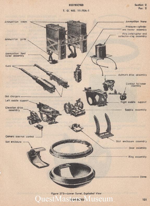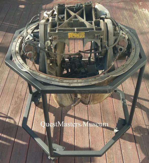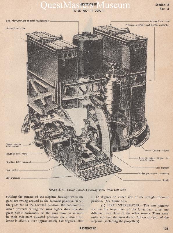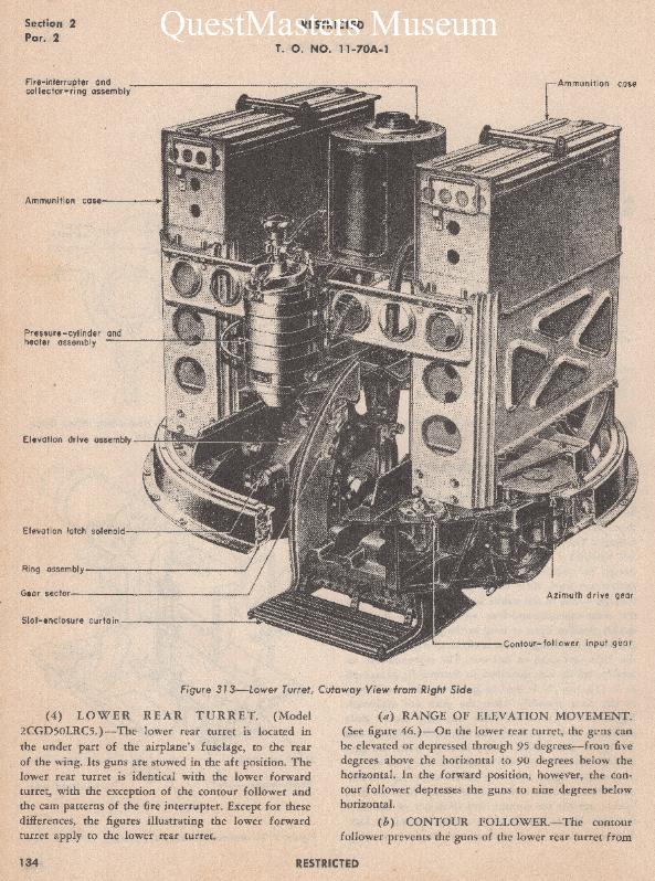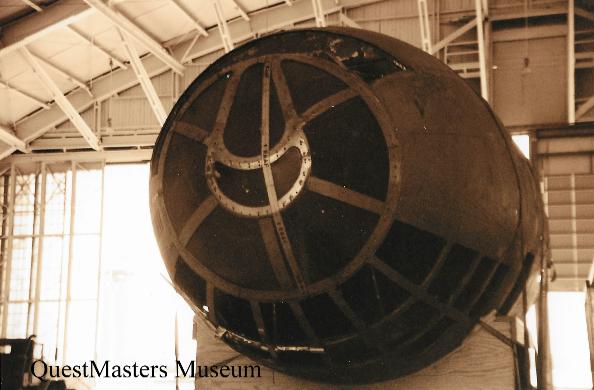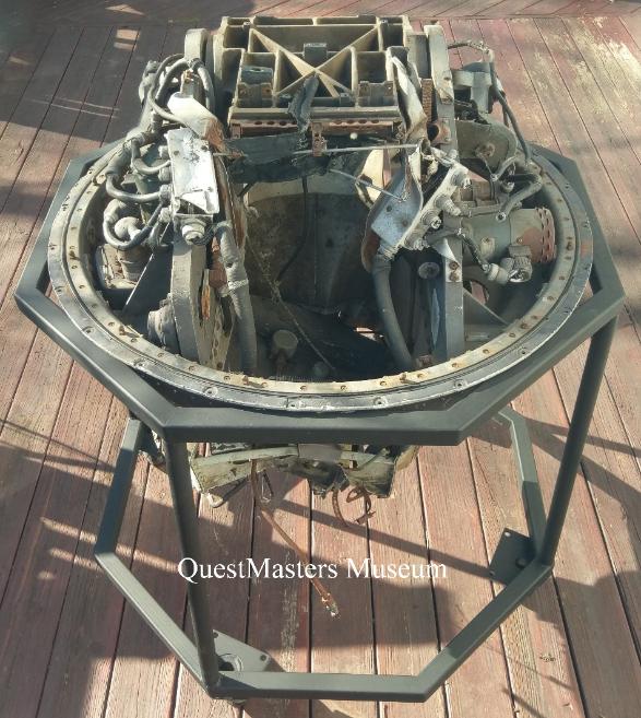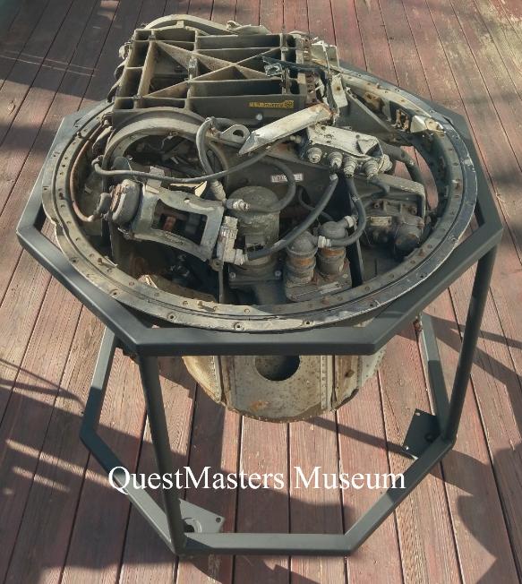 The B-29 "Super Fortress" Lower Forward Turret Model 2CGD50LRC4A, above four photos. The lower turret is quite similar to the two upper turrets in many respects, but it is not merely an upper turret turned upside down. The lower turret can be rotated a full 360 degrees in azimuth. The Lower Forward Turret Model 2CGD50LRC4A and Lower Rear Turret Model 2CGD50LRC5 are identical, except the lower rear turret has different contour follower and cam patterns for fire interruption. The lower turret shown here is currently displayed inverted on a black steel stand, constructed by QuestMasters, for the restoration of this turret. |