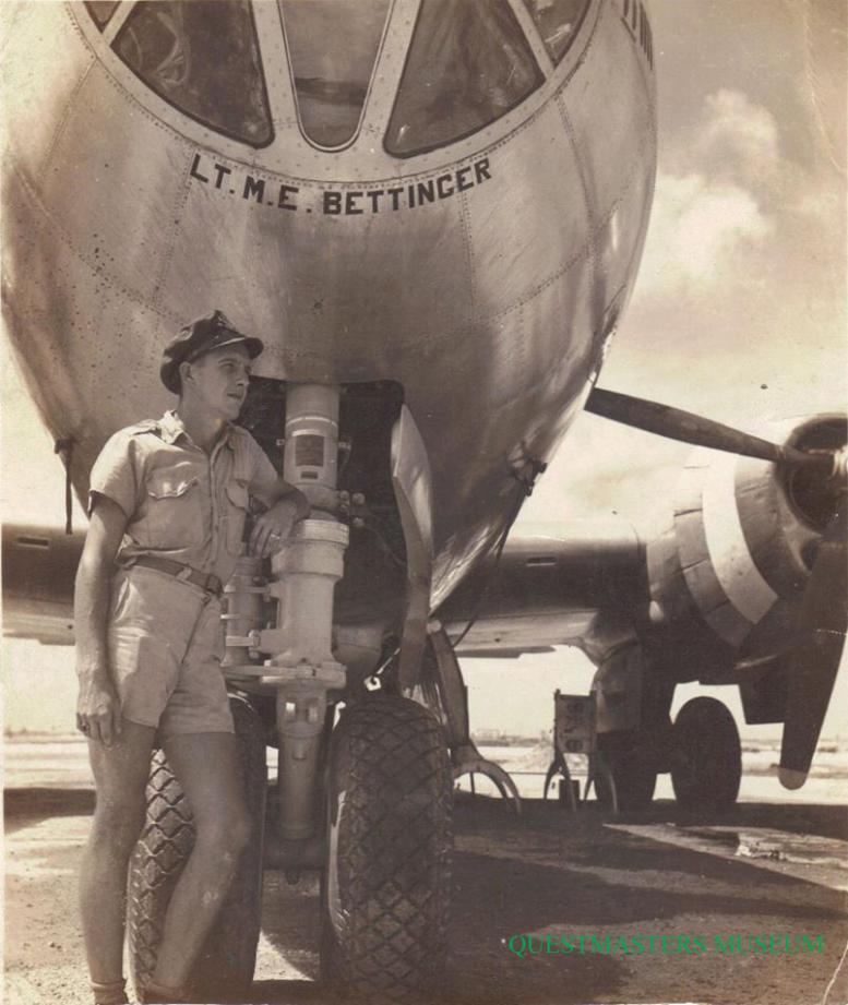 B-29-50-BW 42-24791 "The Big Time Operator", above. In this photo, the aircraft has completed at least 18 bombing missions and at least 5 of the 8 mining mission. Shown here is the Bombardier Lieutenant Maurice Edward Bettinger under the BTO cockpit greenhouse. LT. Bettinger is credited with the two Japanese aircraft that were shot down by "The Big Time Operator". (photo from the estate of the BTO Bombardier Lieutenant Bettinger) |