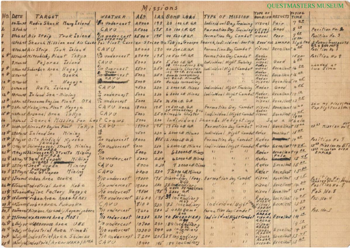 Log book from Bombardier Lieutenant Maurice Edward Bettinger, above. Lt. Bettinger flew almost all of his missions on the B-29-50-BW 42-24791 "The Big Time Operator". Of note, Mission Number 25 for June 1st 1945, Urban Area Osaka Japan, at an altitude of 19,000 feet, as position number 11 in the formation, 1 (Japanese) Fighter was shot down and 1 probable. LT Bettinger is credited with two Japanese aircraft being shot down while crewing the BTO. Another noteworthy entry is March 8th 1945, Nagoya Suburban Area bombing, "Landed at Iwo Jima". The battle of Iwo Jima lasted from February 19th - March 26th 1945. The famous flag raising on Iwo Jima was February 23rd 1945. (from the estate of the BTO Bombardier Lieutenant Bettinger) |
