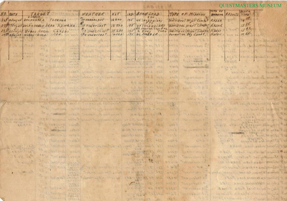 Log book from Bombardier Lieutenant Maurice Edward Bettinger, above. Lt. Bettinger flew almost all of his missions on the B-29-50-BW 42-24791 "The Big Time Operator". (from the estate of the BTO Bombardier Lieutenant Bettinger) |