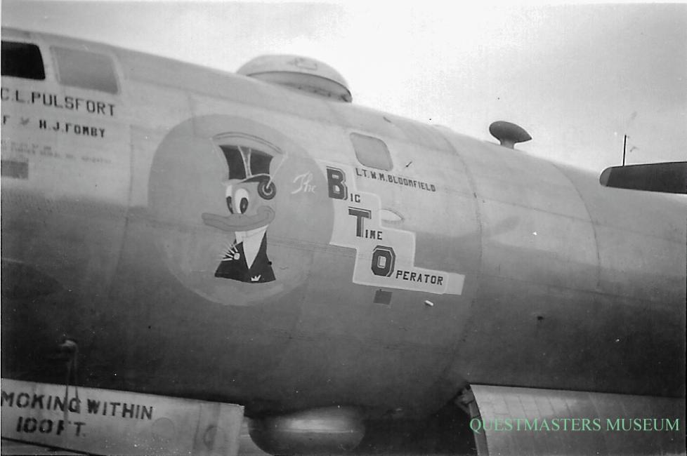 Original color photograph of B-29-50-BW 42-24791 "The Big Time Operator", above. The name LT. W.M. BLOOMFIELD is painted behind the pilot position on the port side of the aircraft next to the Navigator position. Note the covered tear shaped hole to the right of the word "Time". This is where the AN-148 "Rebecca" antenna was previously mounted. The name "Big Time Operator" has been outlined in white. |