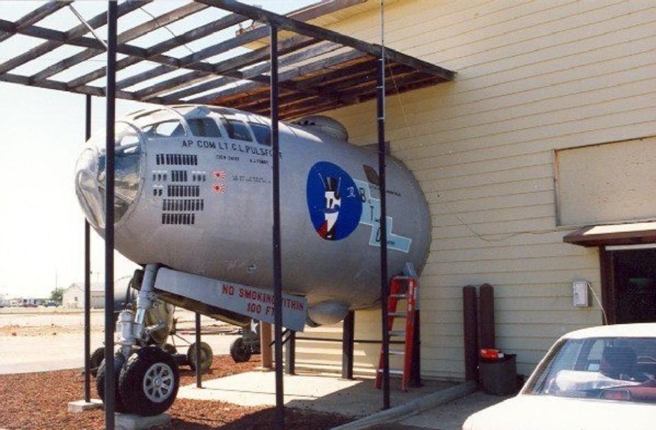The nose section of B-29-50-BW 42-24791 "The Big Time Operator" was eventually recovered from China Lake Naval Weapons Station, California and put on display at the Edward F. Beale Museum, California until 2001, when the museum closed. The nose section was then transferred through the National Museum of the United States Air Force to the New England Air Museum, Connecticut. The nose section, shown here, was covered in a complete coating of automotive "bondo" to give it a smooth appearance and then painted silver. The nose art is already starting to peel away in this photo. |