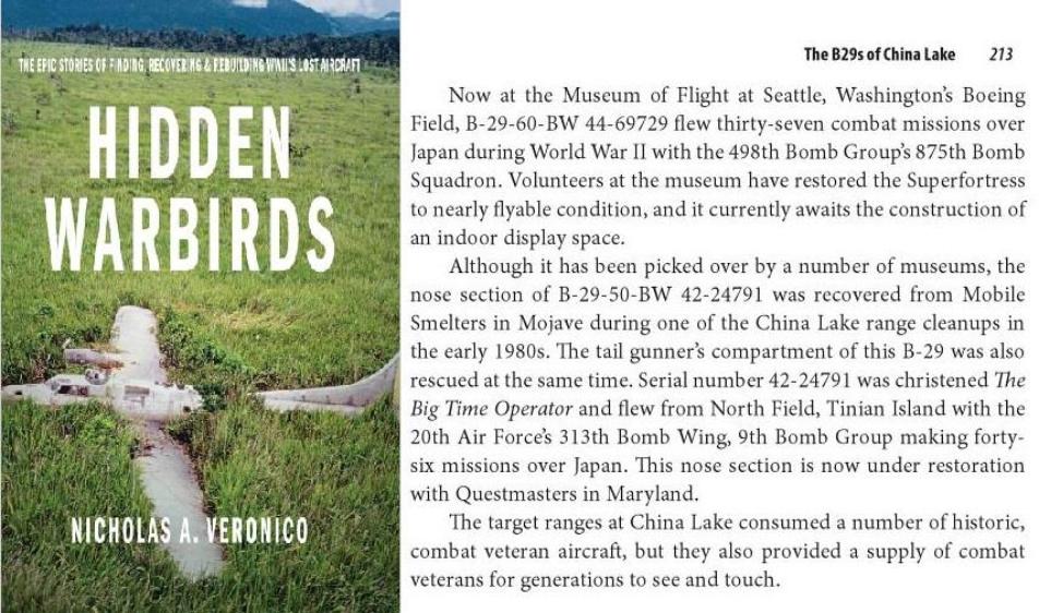 On June 17th 2013, Nicholas A. Veronico released the book "Hidden Warbirds: The Epic Stories of Finding, Recovering, and Rebuilding WWII's Lost Aircraft". B-29-50-BW 42-24791 "The Big Time Operator" is covered under the section for B-29's of China Lake, page 213. The book is available on Amazon, ISBN-10: 9780760344095 and ISBN-13: 978-0760344095 |