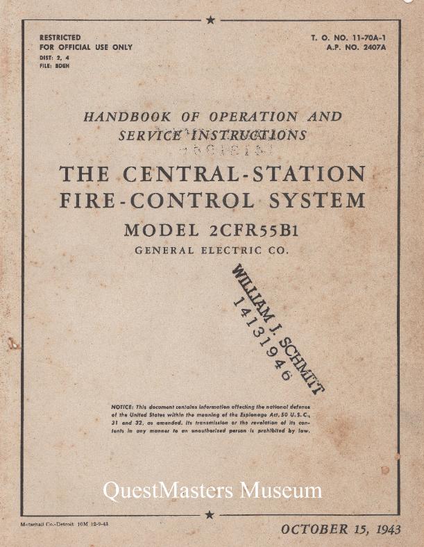 Handbook of Operations and Service Instructions, Central-Station Fire-Control System (CFC) Model 2CFR55B1, AAF Technical Order T.O. No. 11-70A-1, A.P. No. 2407A, October 15th 1943, printed by Motschall Company, Detroit December 9th 1943. This manual was owned by Sgt. William J. Schmitt, Born December 5th 1925, ASN 14131946, Palm Bay, Florida. He served from December 2nd 1943 to June 10th 1946, 236th Army Air Force Base Unit, Pyote, Texas, as a Remote Control Turret Mechanic Gunner. |
