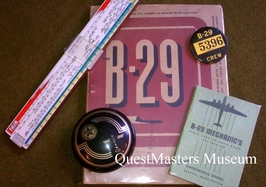B-29 Super Fortress Memorabilia, above photo. Shown here is a B-29 and B-29A Load Adjuster, for balancing the aircraft load; a B-29 Airplane Commander Training Manual, revised February 1st 1945 and reprinted March 1st 1945, AAF Manual No. 50-9; B-29 Mechanics Field Service Data Book, produced by Boeing, Super Fortress School, Seattle Washington, revised March 1944, June 1944, September 1944 and January 1945; a B-29 Crew Badge, Number 5396, used during B-29 crew training in the United States; and a Boeing B-29, Martin Aircraft produced, control wheel cap. Glenn L. Martin produced 531 B-29's in Nebraska. |
