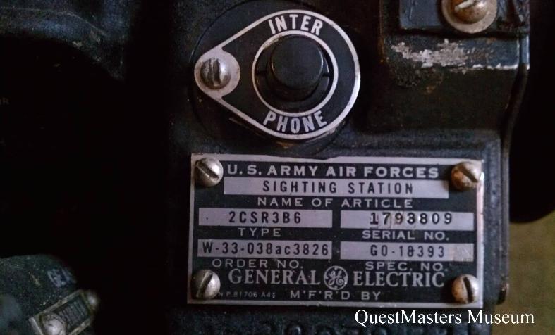Sighting Station 2CSR3B6, General Electric Company, above left and right photo. The B-29 "Super Fortress" used four Sighting Stations in the aircraft. The Nose-Sighting Station used the Type 2CSR3C1. Two of the Type 2CSR3B1 or 2CSR3B2 were mounted in the both waist gunner blister positions. The tail gun position used the Type 2CSR3B3 Sighting Station. The Sighting Station, shown here, is the Type 2CSR3B6, Serial Number 1793809, Order Number W-33-038ac3826, Spec. No. GO-18393. It will be used in the restoration of the B-29 "The Big Time Operator" in either the nose position or the tail position, replacing the correct designated Sighting Station. |