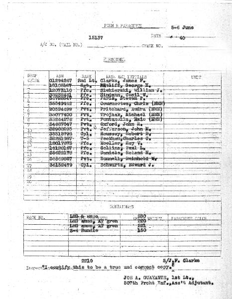 The destination of 43-15137 (Chalk 40), as well as the other 44 aircraft for Mission "Boston" was Drop Zone T, the Merderet Sector of the Cotentin Peninsula. The objective was Amfreville. The responsibility for this objective was trusted to the members of the 82nd Airborne Division, 507th Parachute Infantry Regiment (PIR). The order was to hold the La Fiere causeway in support of the 505th PIR (ordered to seize the town of Sainte-Mere-Eglise) and hold the defensive line between Gourbesville and Le-Hameau-Renouf. At approximately 0244 hrs on June 6th, Chalk 40 dropped her paratroopers: Position 1: 2nd Lt. James F. Clarke O-1294267 (KIA 13 June 1944) Position 2: Sgt. George H. Ratliff 18108127 Position 3: PFC William J. Siekierski 12073110 Position 4: PFC Cecil W. Hindman 38232461 Position 5: PFC Steven P. Paris 36728347 Position 6: PFC Chris Courneotes 33549442 Position 7: Pvt. Audra Pritchard 20524699 Position 8: Pvt. Michael Tojchak 33077400 Position 9: Pvt. Ezio Fontanella 33264276 Position 10: Pvt. John R. Oxford 34687047 Position 11: Pvt. John M. Jefferson 32808293 (KIA 7 June 1944) Position 12: Cpl. Robert B. Roussey 33315798 Position 13: T-5 Charles C. Peckham 32281987 (KIA 19 January 1945) Position 14: PFC Roy V. Moeller 18017873 Position 15: PFC Paul L. Collins 14120167 Position 16: PFC Roland H. Daniel 35622178 Position 17: Pvt. Reinhold W. Bonnell 36569887 (KIA 15 June 1944) Position 18: Cpl. Edward J. Schwartz 36152479 |