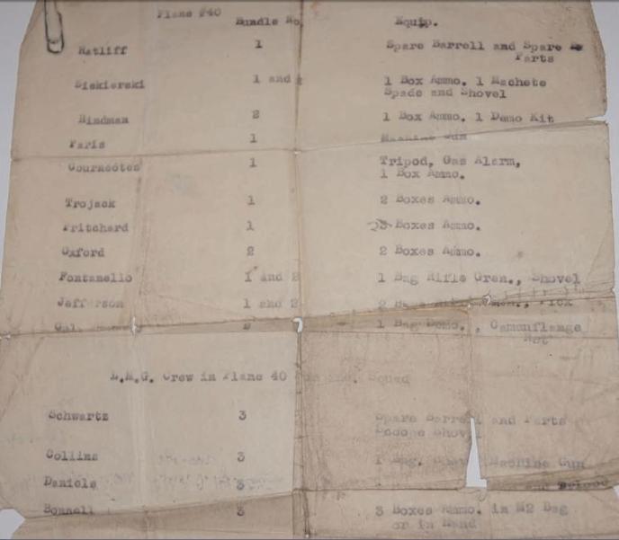 C-47A 43-15137 carried 4 parapacks under the aircraft on June 6th 1944 as "Chalk 40" as documented on Form B, signed by Lt James F. Clarke, above left photo. Every paratrooper on Chalk 40 was assigned a parapack or bundle after deployment. The original document in the above right photo was retained by Cpl. Robert B. Roussey. This is the bundle assignment for "Chalk 40": Ratliff, Bundle 1, Spare Barrel / and Spare Parts; Siekierski, Bundle 1 and 2 - 1 Box Ammo / 1 Machete Spade and Shovel; Hindman, Bundle 2, 1 Box Ammo / 1 Demo Kit; Paris, Bundle 1 Machine Gun; Courneotes, Bundle 1, Tripod / Gas Alarm / 1 Box Ammo; Trojack, Bundle 1, 2 Boxes Ammo; Pritchard, Bundle 1 and 2, 3 Boxes Ammo; Oxford, Bundle 2, 2 Boxes Ammo; Fontanello, Bundle 1 and 2, 1 Bag Rifle Grenades / Shovel; Jefferson, Bundle 1 and 2, 2 Bags Rifle Grenades / Pick; Cpl. Roussey, Bundle 2, 1 Bag Demo. / Camouflage Net. L.M.G. Crew in Plane 40 from 2nd. Squad: Schwartz, Bundle 3, Spare Barrel and Parts / Scoop Shovel; Collins, Bundle 3, 1 Bag. Shovel and Machine Gun; Daniels, Bundle 3, 2 Boxes Ammo and Tripod; Bonnell, Bundle 3, 3 Boxes Ammo. in M2 Bag or in Hand. |