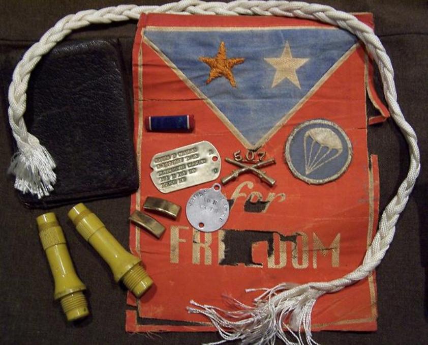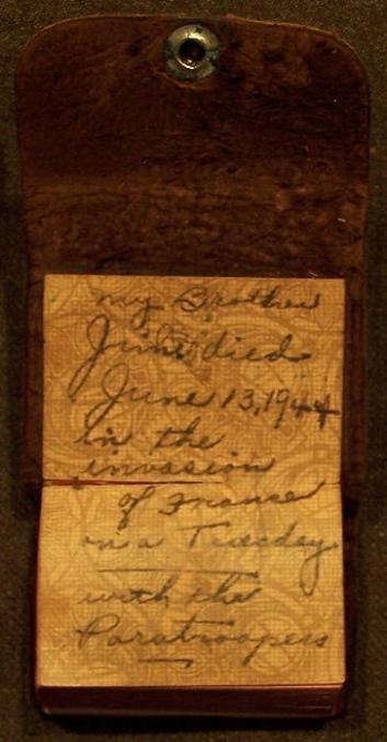 When 2nd Lt. James F. Clarke was killed, his personal effects were sent to his mother Elizabeth Clarke, above left photo. His effects included his wallet, insignia, dog tags (one early war brass and one pre-war steel style), two aircraft spark plug shipping plugs and a lanyard made from parachute cord. His mother embroidered a gold star over the flag that she had for her two sons that were in the service. His brother wrote on the inside cover of his pocket dictionary: "My Brother Jim died June 13, 1944 in the invasion of France on a Tuesday with the Paratroopers", above right photo. To read the detailed story of 2nd Lt. James F. Clark, CLICK HERE |
