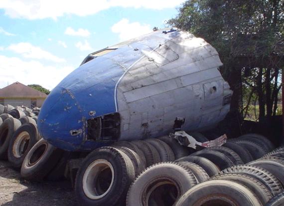 C-47A 43-15137 wearing the colors as N98HA, just prior to destruction - Brownsville TX 2006, above left photo. C-47A 43-15137 after destruction, above right photo. Her nose section is all that remains of her proud past....but, it has been saved. QuestMasters will restore this section with her wartime paint scheme of the 306th Troop Carrier Squadron nose code 7H. |