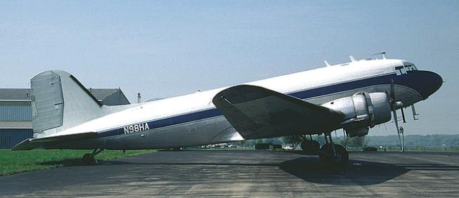 C-47A 43-15137 wearing the colors of Guyana Airways, registration 8R-GAG Barbados 1969, above left photo. C-47A 43-15137 wearing the colors as N98HA - Ohio U.S.A. 1986, above right photo. |