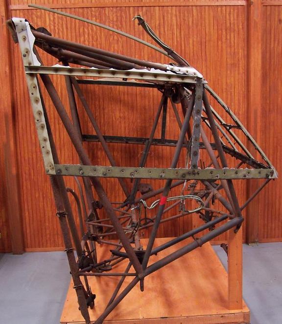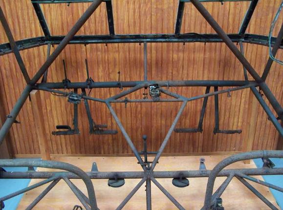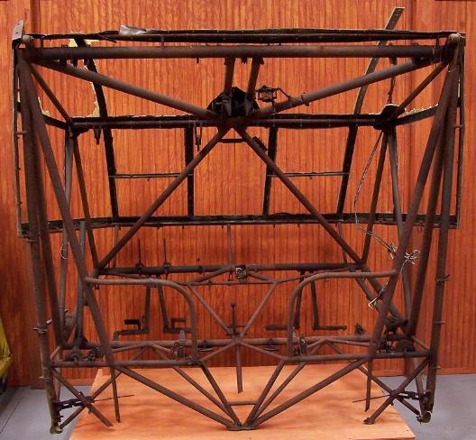 | CG-4A Glider Cockpit, above photos. This cockpit was found in New Jersey in early 2007. Most of the tubing is in very good condition, but the bottom rear section has some very bad corrosion. The top two center window frame sections are also missing. |
