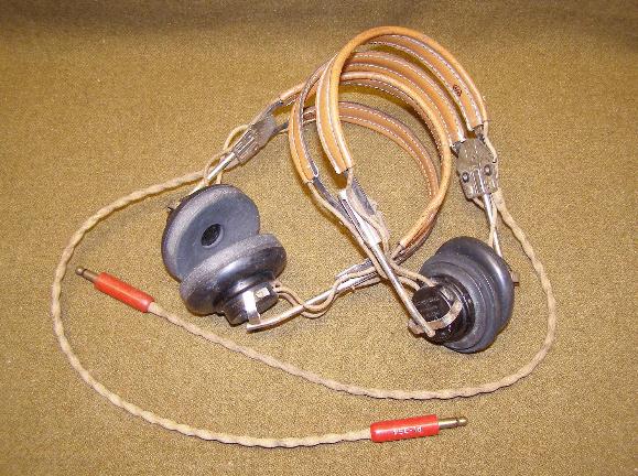 | HS-33 Headset, above left and right photo. The CG-4A Glider utilized three HS-23 or HS-33 Headsets in the cockpit. One was used for the Pilot, one for the Co-Pilot and a third for use by a crew member or passenger. During 1943, the HS-33 low impedance headset was introduced based on the ANB-H-1 Earphone with an impedance of 600 ohms. For a period, the HS-23 and HS-33 Headsets were used in parallel. The HS-23 was equipped with a black PL-54 Plug and the HS-33 with a red PL-354 Plug. It was possible to use the low impedance HS-33 Headset in a high impedance aircraft communication system by connection through a MC-385 Adapter. |