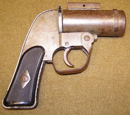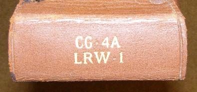 | AN-M8 Pyrotechnic (Flare) Pistol, above left photo. The AN-M8 Flare Pistol was stored in the Type M-2 Pistol Container with the Type M-6 Signal Flare Container containing 12 AN-M37-42 Aircraft Signals. Load Adjuster with Case, right photo. Each aircraft was supplied with one load adjuster with case for balancing cargo prior to flight. The load adjuster was supplied with a leather case and was mounted in the cockpit of the CG-4A. The end of the case is marked CG-4A and LRW-1. The LRW-1 was the Navy and Marine Corps version of the Army Air Force CG-4A. |
