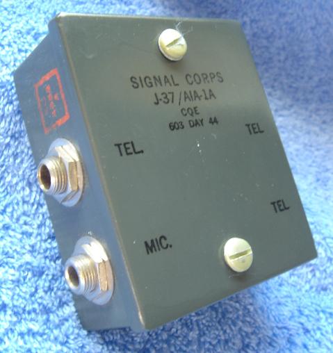 | J-37/AIA-1A Radio Jack Box, left photo. The J-37/AIA-1A or J-37-AIA-1A Jack Box was mounted under the pilot's instrument panel. This box connected the three HS-33 Headsets and the T-17-B Microphone to the aircraft radio system. The box pictured to the right is a New Old Stock (NOS) example of the Radio Jack Box. This box is not in the QuestMasters collection and pictured for reference only. |
