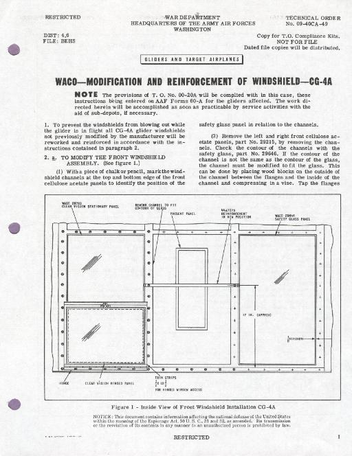 | Technical Order TO No. 09-40CA-49 (shown left) directed that all CG-4As that had not been previously modified by the manufacturer to have their windshield reworked and modified to prevent windshields from blowing out during flight. The CG-4A Cockpit shown on this page has had this modification. The four sections of glass (shown above) are the replacement glass sections used for this modification and will be used during the restoration. |