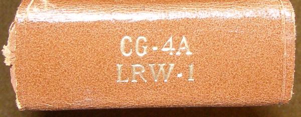 | Load Adjuster with Case, right photo. Each aircraft was supplied with one load adjuster with case for balancing cargo prior to flight. The load adjuster was supplied with a leather case and was mounted in the cockpit of the CG-4A. This load adjuster carries the serial number 157690 on the front of the case. The end of the case is marked CG-4A and LRW-1. The LRW-1 was the Navy and Marine Corps version of the Army Air Force CG-4A. |