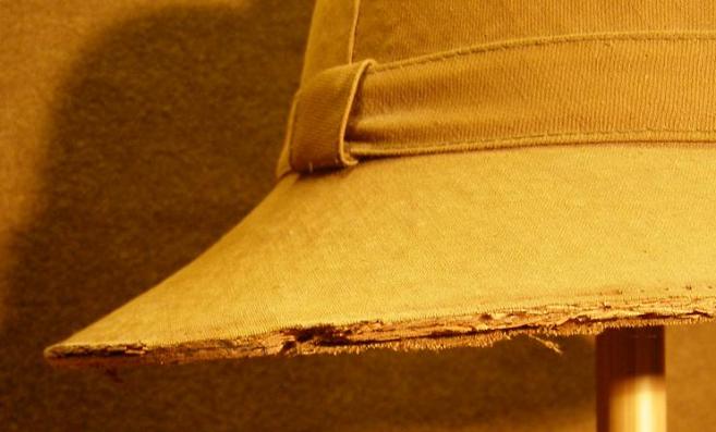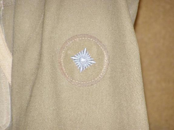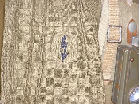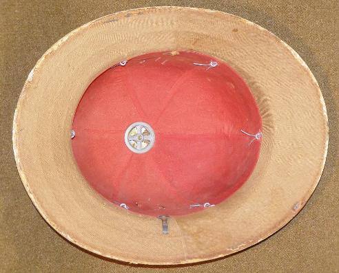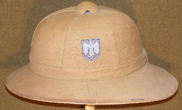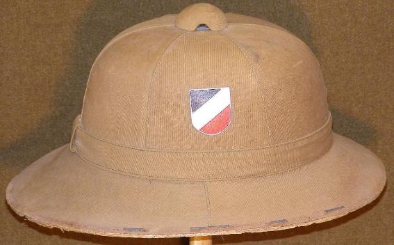 Heer (Army) Tropical Helmet, First Pattern, above four photos. The Heer Insignia on the left side is made of zinc. The tri-color National Insignia on the right side is made of aluminum. This helmet is constructed from stretched tan cotton fabric over a pressed wood form. This is unusual as most of the helmets produced are constructed from pressed cork. The blond leather liner band is missing from this helmet, but all six aluminum cotter pins remain in place. |