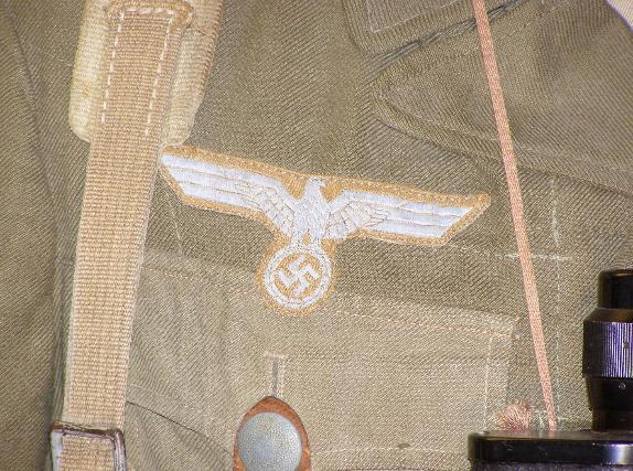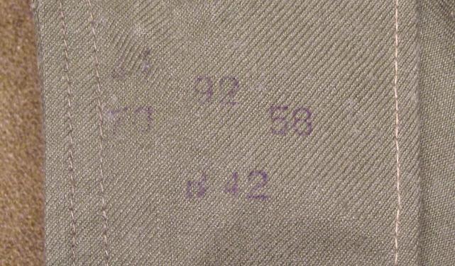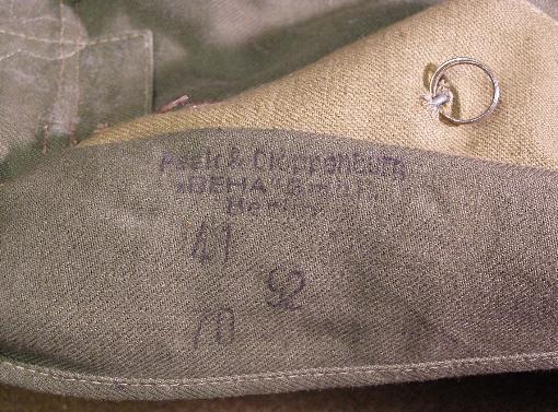 Inside tunic right bottom button flap, left photo. Marked: 41 (top left), 92 (center), 70 (bottom left), 58 (bottom right) and B 42 (bottom center). Inside tunic left center button flap, right photo. Note removable buttons. Marked: Peek & Cloppenburg "BEHA" G.m.b.H. Berlin 41 (top left), 92 (center) and 70 (bottom left) |