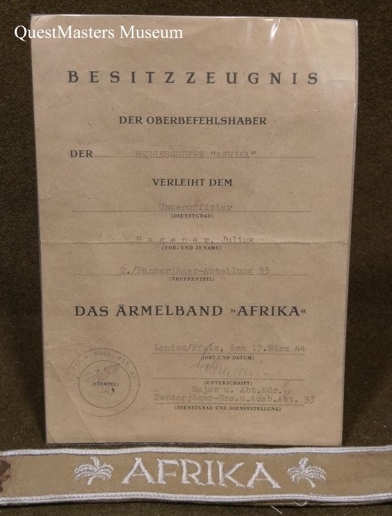 German Afrika Cuff Title and Award Certificate, above photo. This Afrika cuff title was awarded to Unteroffizerier Julius Hagener, 2./Panzerjager-Abteilung 33 on March 17th 1944, for service in Africa. |
