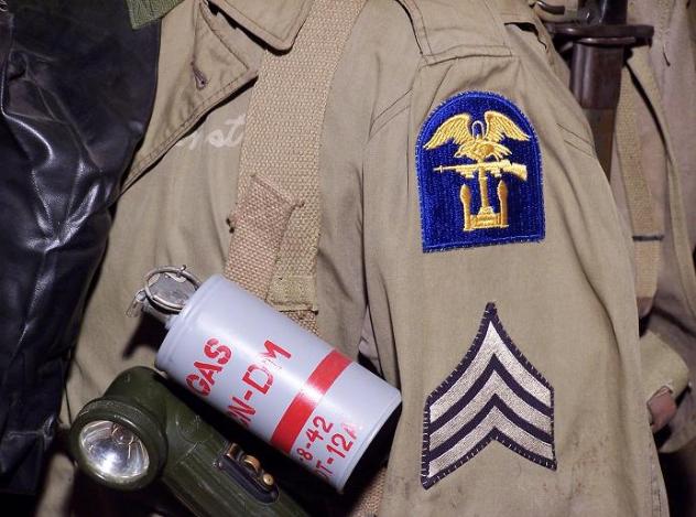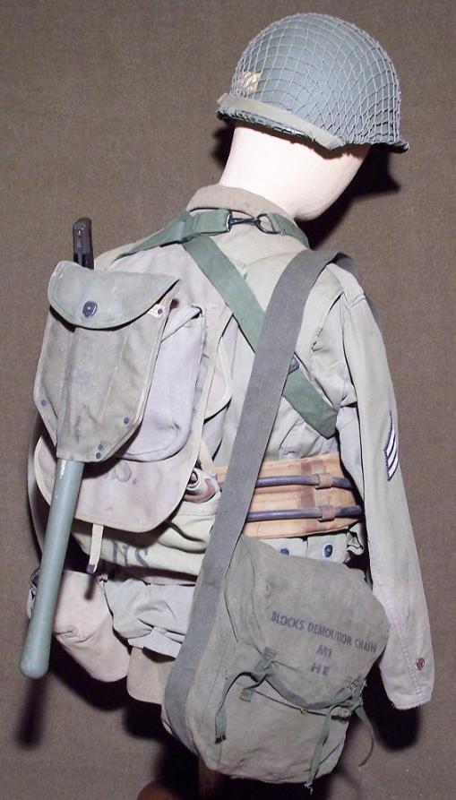 | M-1 Helmet M-1 Helmet Liner, made by Westinghouse M-1941 Jacket with Engineer Amphibian Command patch on left sleeve M-1923 Dismounted Cartridge Belt, made by H.S.CO. 1943 M-1928 Haversack M-1910 Dismounted Canteen Cover, made by JEFF Q.M.D. 1942 M-1910 Canteen, made by R.S.E. 1943 M-1910 Canteen Cup, made by INGERSOLL PRODUCTS M-1942 First Aid Pouch, made by B.B.S.CO. 1943 M-1943 Entrenching Tool, made by AMES 1943 M-1943 Entrenching Tool Cover, made by D.A. BROWN MFG. CO. 1943 M-1 Bayonet, made by PAL TL-122B Flashlight, made by BRIGHT STAR Wire Cutter Pouch, made by SCHELL LEA. GDS. CO. INC. 1944 M-1916 Holster, made by SEARS 1942 M-7 Assault Gas Mask Carrier USN Life Preserver, made by DURKEE-ATWOOD CO. MK-II Fragmentation Hand Grenade M2 Irritant Gas Grenade M1 Demolition Chain Block Bag |