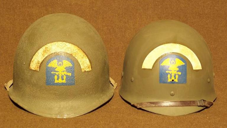| Left side of the M-1941 Jacket, left photo. The Engineer Amphibian Command Service Sleeve Insignia (SSI) is sewn to the top of the sleeve with Sergeants stripes sewn to the center of both sleeves. M-1 Helmet, right photo. The 5th and 6th Engineer Special Brigades marked their helmets with a large white arc over the Engineer Amphibian Command insignia. |