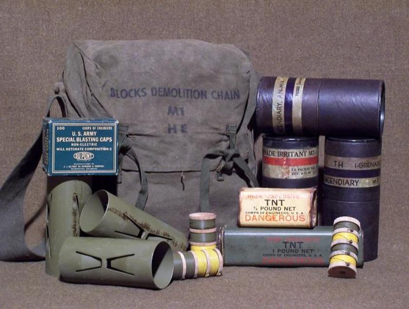 | Engineer Explosives and Equipment, left photo. M1 Demolition Blocks Chain Bag AN-M14 Incendiary Grenade Tube (2 shown) M2 Irritant Gas Grenade Tube Blasting Cap Box TNT 1/2 Pound Block TNT 1 Pound Block Trip Wire Spools (3 shown) Bangalore Torpedo Clips (3 shown) |