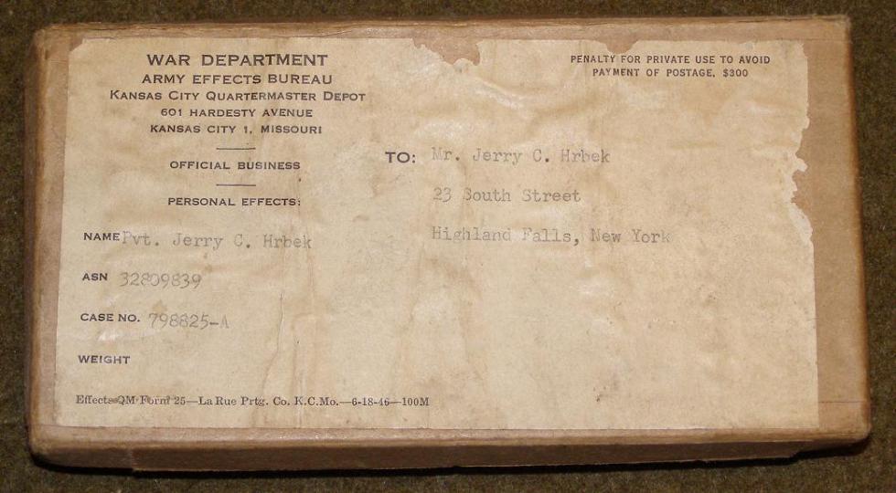 | PVT Jerry C. Hrbek Personal Effects Box, above photo. This box was sent by the War Department Army Effects Bureau, Kansas City Quartermaster Depot, 601 Hardesty Avenue, Kansas City 1, Missouri to Mr. Jerry C Hrbek, 23 South Street, Highland Falls New York. The box lists the Name: Pvt. Jerry C. Hrbek, ASN 32809839, Case No. 798825-A on Effects QM Form 25 - La Rue Prtg. Co. K.C. Mo. - 6-18-46 - 100M The cardboard box contained the personal effects from Private Hrbek after he was Killed in Action on Okinawa. |