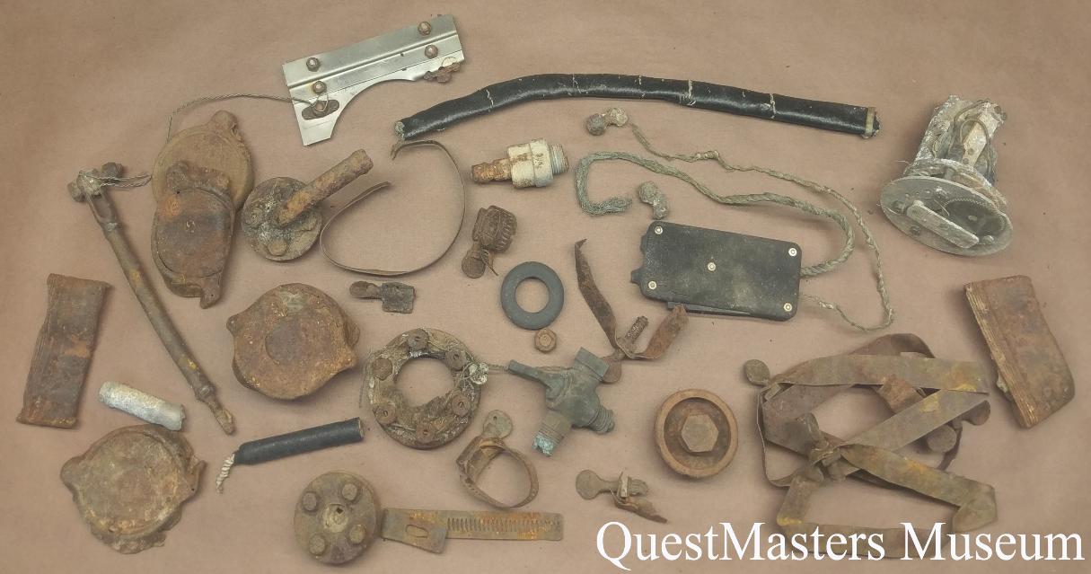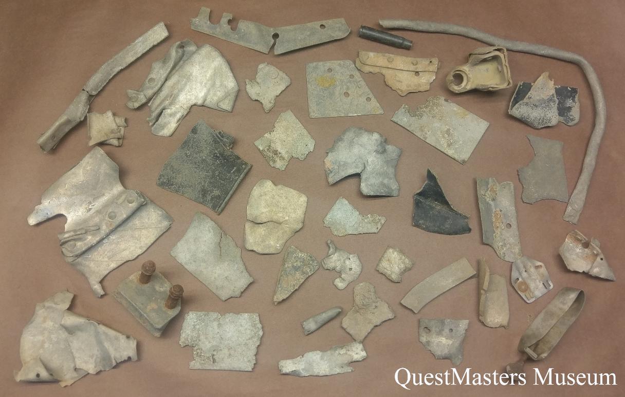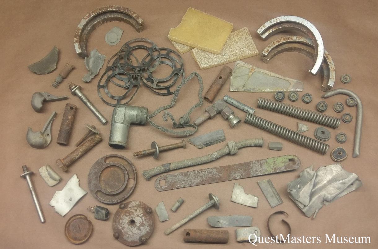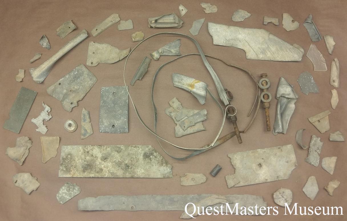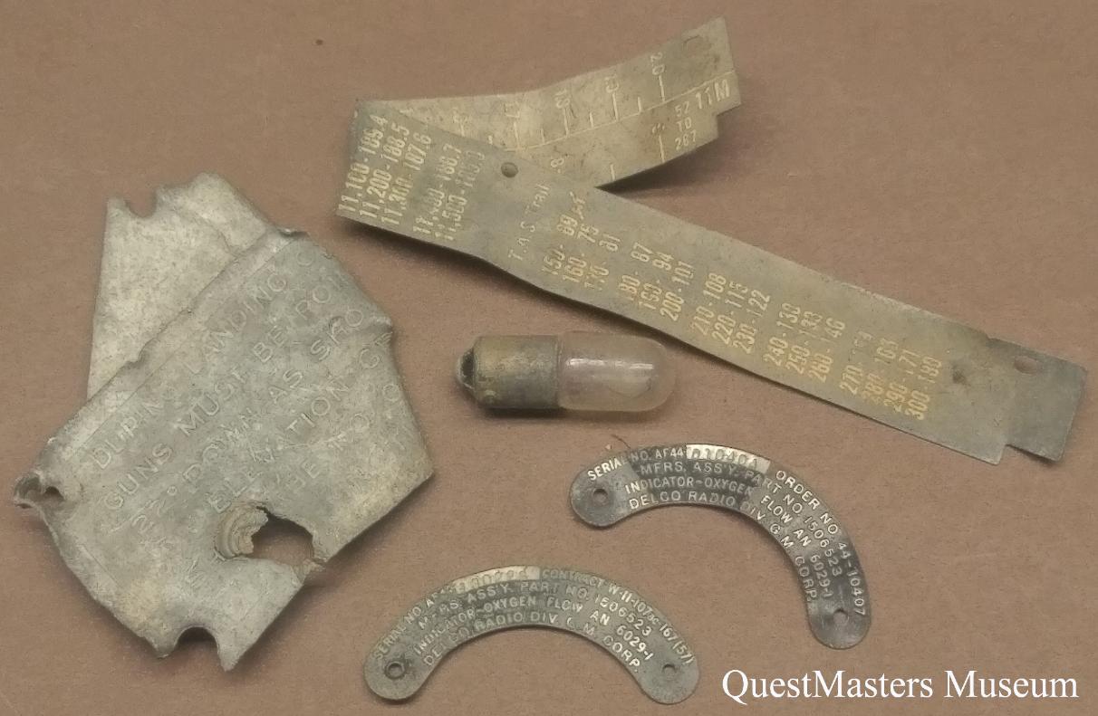 | Small fragile WWII aircraft pieces from Depot 41, Kingman Army Air Field, above photo. For very small fragile artifacts to survive in the open desert for 70 years is amazing. The two square mile area to the south of Kingman Army Air Field had heavy movement across it between 1946 and 1948, processing over 5,000 aircraft for on-site destruction and smelting. The two square mile search area, roughly 900 football fields in size, that was searched by QuestMasters between 2015 and 2017, yielded many small historic WWII artifacts from combat-used aircraft. The fragile small artifacts, shown above, are a WWII aircraft gun turret nomenclature plate, above left; two WWII AN 6029-1 Oxygen Flow Indicator Nomenclature Plates, bottom center; an unbroken WWII aircraft instrument panel illumination bulb, center of photo; and a Norden Bombsight Tangent Scale for the bombing computer. This Tangent Scale was part of the Bombardiers carry-on equipment, that was held in a wooden case, for calculations for each bomb load. This scale was left behind in one of the combat aircraft that was destroyed at Kingman, and fell from the aircraft into the desert when it was cut apart. These artifacts were found by QuestMasters in 2015 and 2017. |