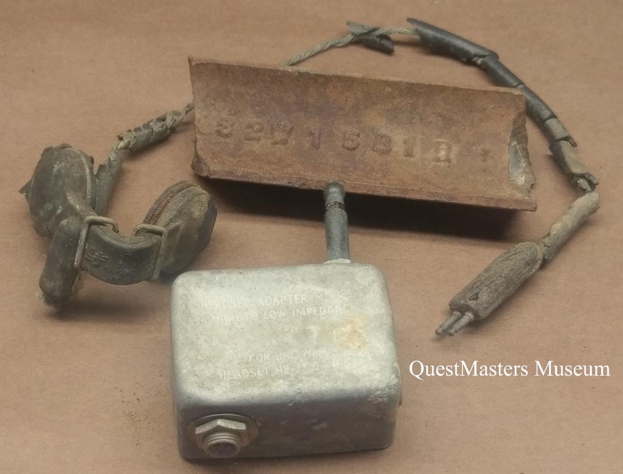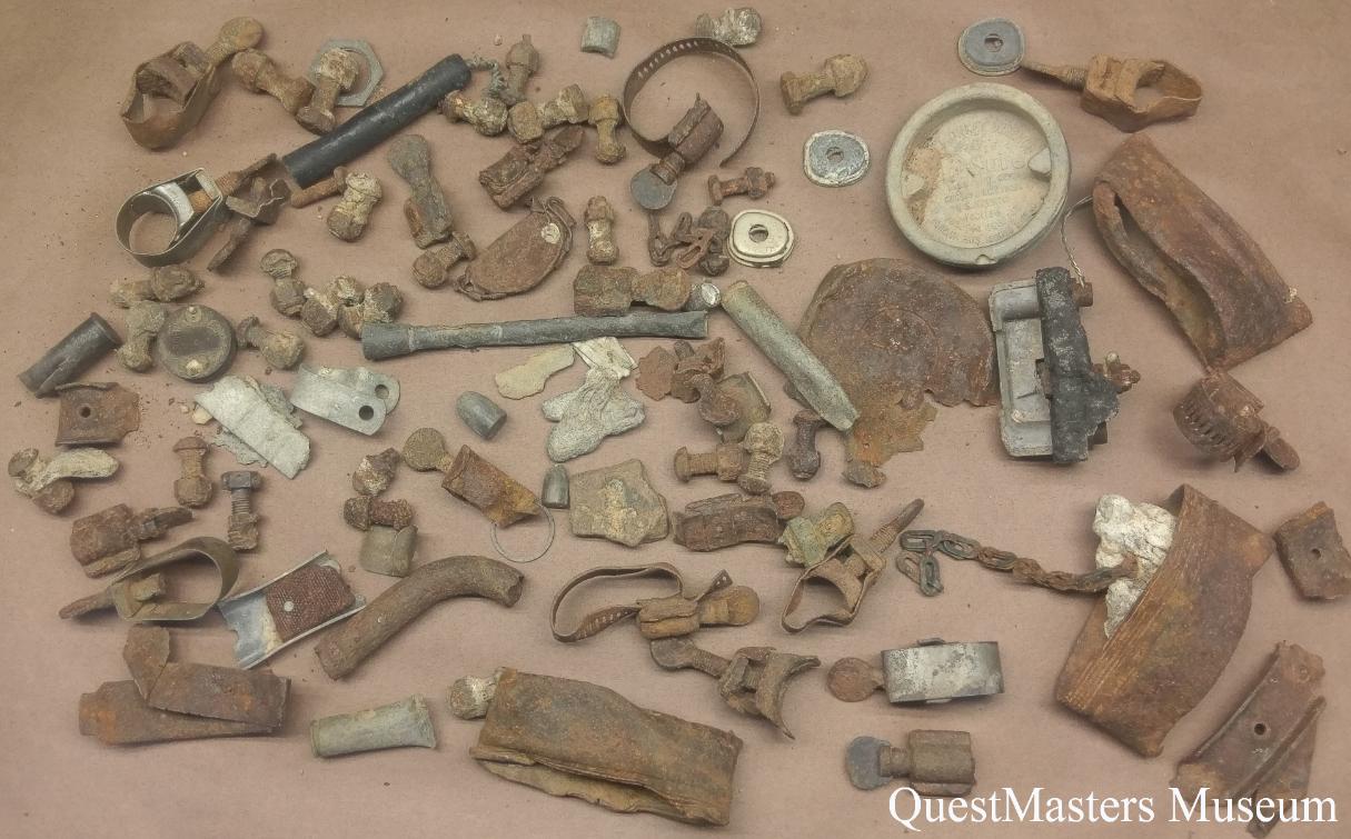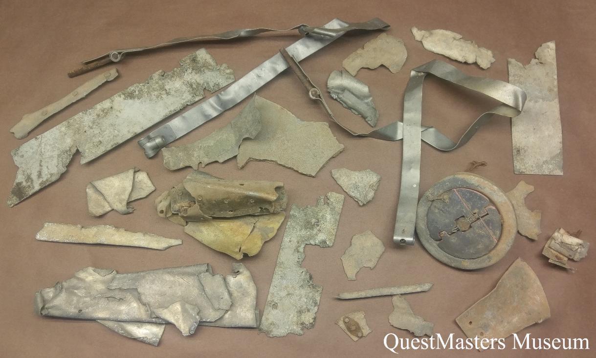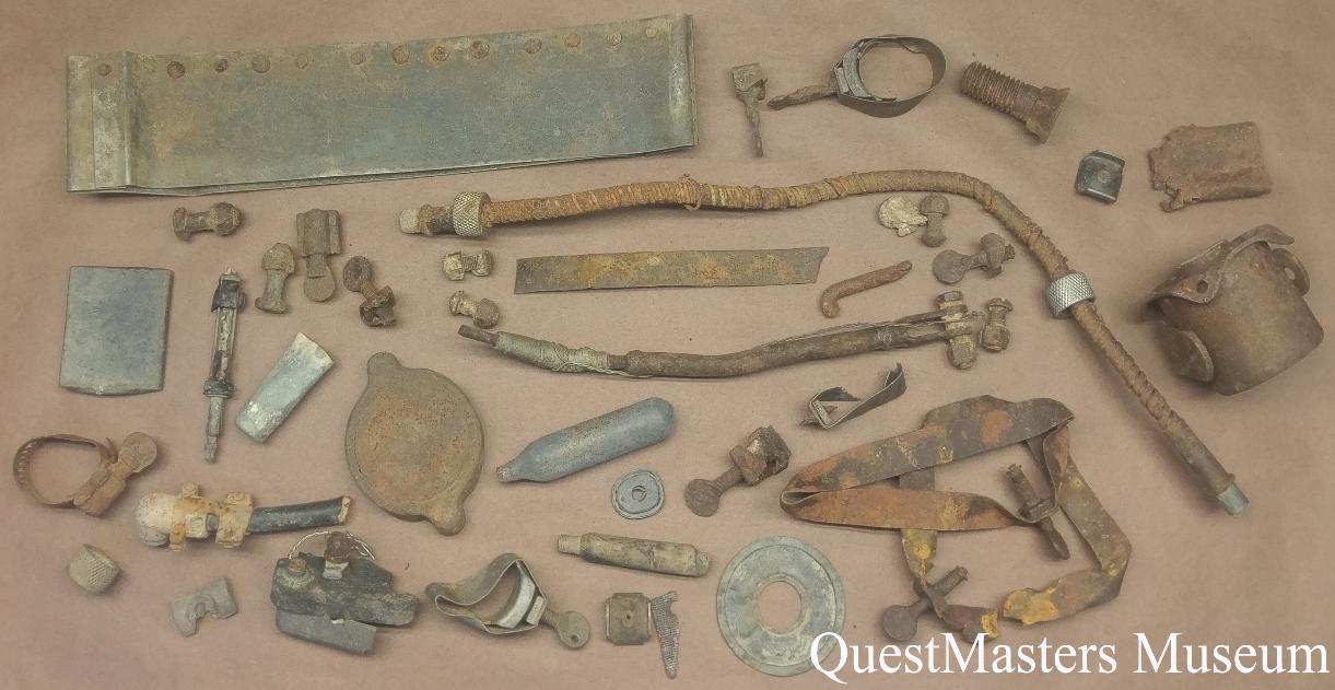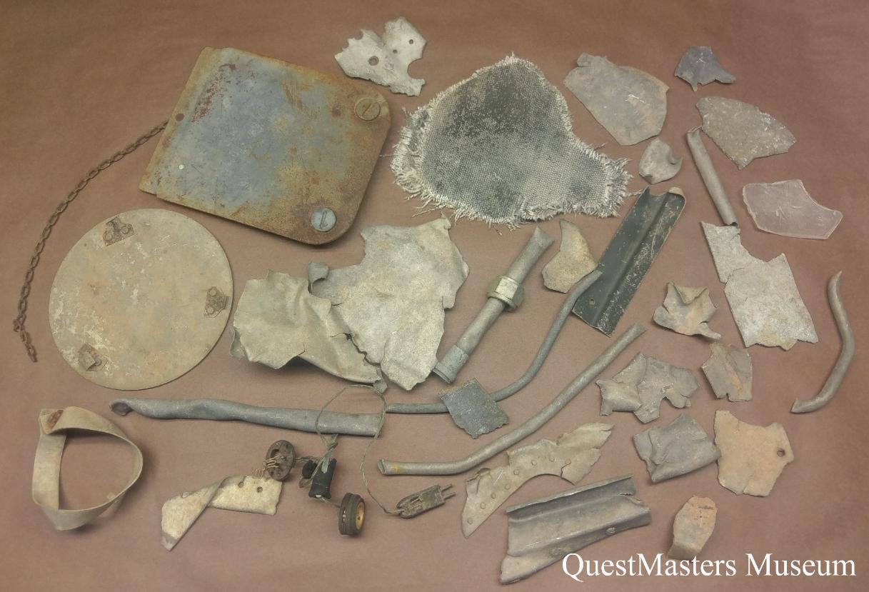 | Small fragile WWII aircraft pieces from Depot 41, Kingman Army Air Field, above photo. For very small fragile artifacts to survive in the open desert for 70 years is amazing. The two square mile area to the south of Kingman Army Air Field had heavy movement across it between 1946 and 1948, processing over 5,000 aircraft for on-site destruction and smelting. The two square mile search area, roughly 900 football fields in size, that was searched by QuestMasters between 2015 and 2017, yielded many small historic WWII artifacts from combat-used aircraft. The fragile small artifacts, shown above, are a WWII aircraft gun turret nomenclature plate, above left; two WWII AN 6029-1 Oxygen Flow Indicator Nomenclature Plates, bottom center; an unbroken WWII aircraft instrument panel illumination bulb, center of photo; and a Norden Bombsight Tangent Scale for the bombing computer. This Tangent Scale was part of the Bombardiers carry-on equipment, that was held in a wooden case, for calculations for each bomb load. This scale was left behind in one of the combat aircraft that was destroyed at Kingman, and fell from the aircraft into the desert when it was cut apart. These artifacts were found by QuestMasters in 2015 and 2017. |