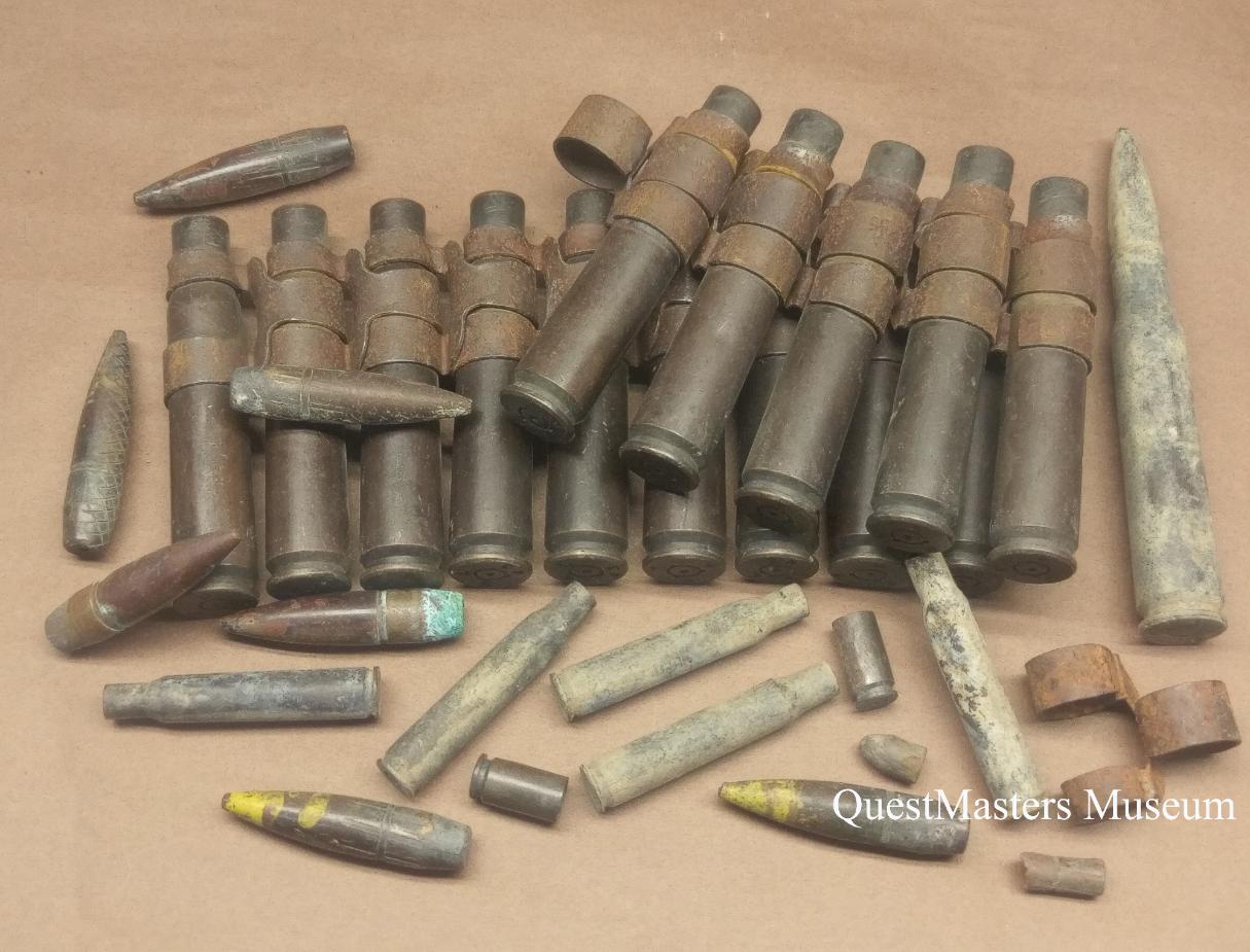 | WWII .30 caliber and .50 caliber projectiles and casings, above photo. The casing and projectiles, shown above, were recovered from the area around Kingman Army Air Field by QuestMasters Museum in 2015 and 2017. It is not certain if these projectiles and casing were fired during Aerial Gunnery Training at the field or fell from the combat aircraft when they were scrapped. The two yellow painted fired .50 caliber projectiles, at the bottom of the photo, are definitely from gunnery training. Army Air Force instructors would paint the projectiles different colors so they could tell which student was hitting a target correctly. The paint on the nose of the projectile would leave a colored mark on the target. Different colors were used for multiple gunnery students firing at the same time. These colors were different from factory produced projectile colors being used during WWII: black = Armor Piercing, red = Tracer, silver = Armor Piercing/Incendiary, blue = Incendiary. The headstamps on the bottom of the cartridge casings are: .30 caliber, FA 34, TW 42, DEN 41; .50 caliber, U 43, LC 43, M 43. |