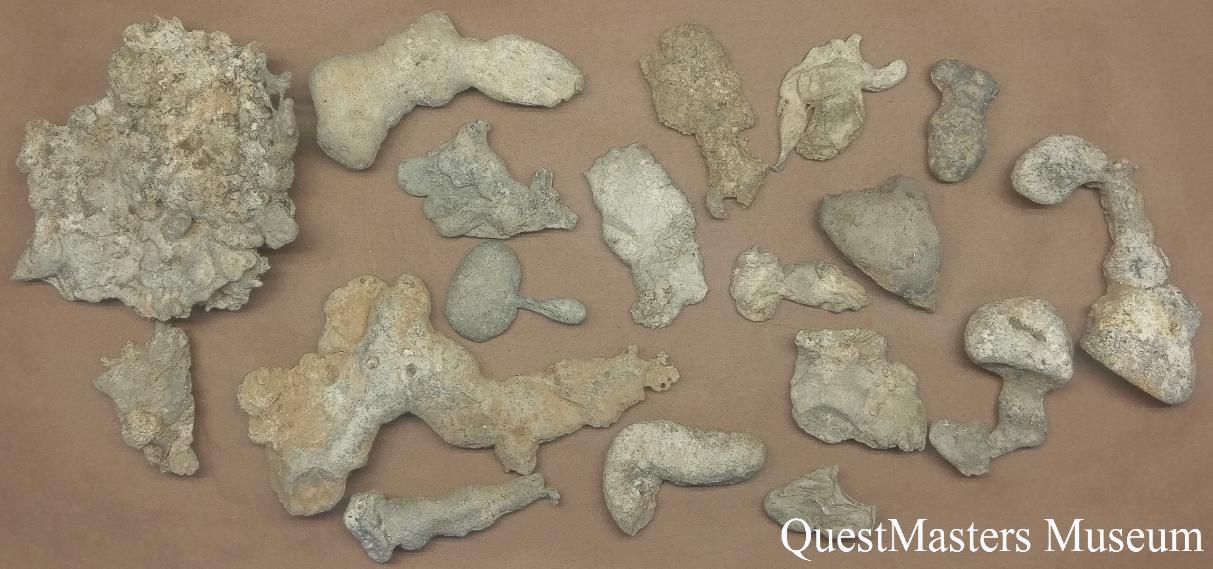 | WWII aircraft melted aluminum nuggets and splatter, above photo. The aluminum nuggets, shown above, were recovered by QuestMasters Museum, from the area where the mobile smelters operated at Kingman Army Air Field between 1946 and 1948. The former smelter location was found by QuestMasters Museum in 2015 and again in 2017. When the large sections of WWII combat aircraft were pushed into the smelters to be melted into large aluminum ingots, shown below, large globs of aluminum from the melted aircraft were deposited in the surrounding ground. These aluminum nuggets are roughly the size of a chicken egg or small lemon. |