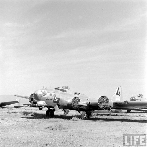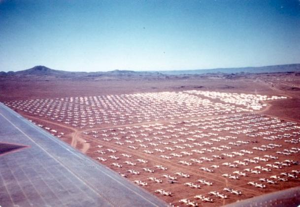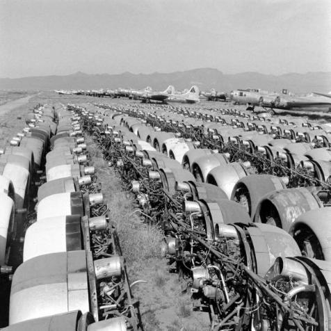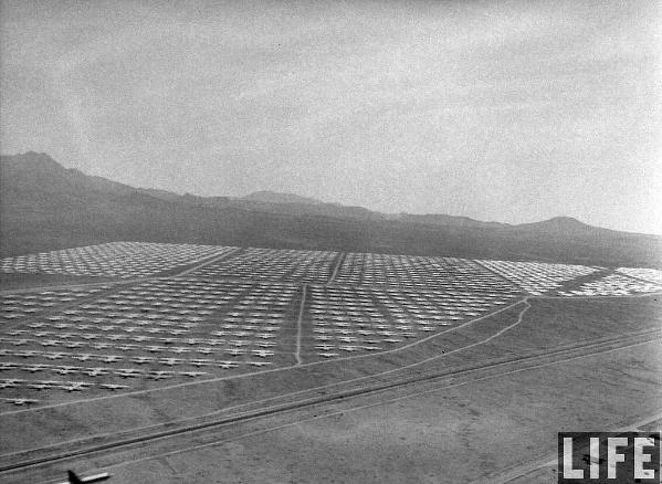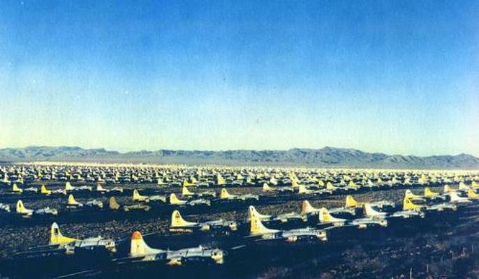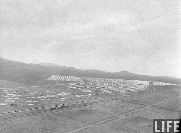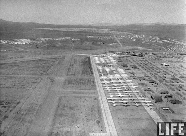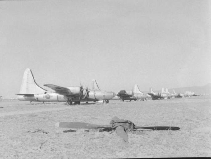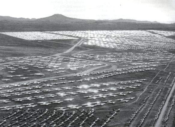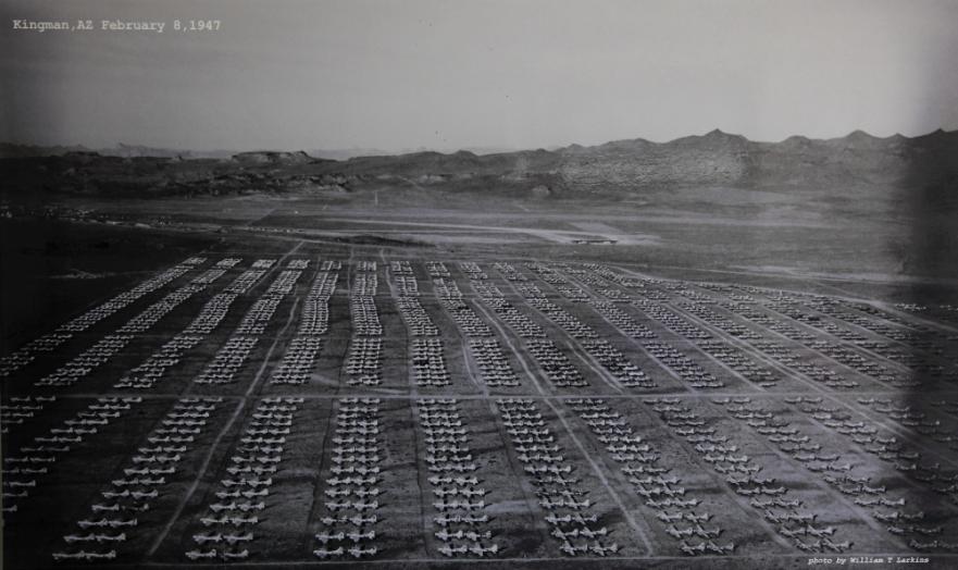 | History of Kingman Army Airfield and Depot 41, Kingman, Arizona: Kingman Army Airfield was established on May 7th 1943 as a training base for Army Air Force aerial gunners. In addition to the main base, the Kingman Ground-to-Ground Gunnery Range and Kingman Air-to-Air Gunnery Range was located about six miles north of the present city limits of the City of Kingman. From this point, the former practice gunnery ranges extended northward approximately 31 miles, generally following the Hualapai Valley. After 1945, there was no need for a gunnery school to remain at Kingman. On November 15th 1945, the property was declared surplus, and between 1946 and 1950 the various parcels were returned and leases cancelled. After the war, the Reconstruction Finance Corporation established five large storage, sales and scrapping centers for Army Air Forces aircraft. These were located at: Albuquerque Army Air Field, New Mexico; Altus Army Air Field, Oklahoma; Kingman Army Air Field, Arizona; Ontario Army Air Field, California; and Walnut Ridge Army Air Field, Arkansas. A sixth facility for storing, selling and scrapping Navy and Marine aircraft was located at Clinton, Oklahoma. The War Assets Administration came to Kingman AAF to set up Sales & Storage Depot No. 41. Depot 41 was to sell-off the base buildings and equipment. In addition, the former Kingman Field would store aircraft from the Army Air Force. Official estimates of over 5,000 WWII warbirds, many of which were heavily used combat veterans of the European and Pacific Campaigns, were flown to Kingman in 1945 and 1946 for storage and sale. 38 of the 118 B-32 "Dominator" Very Heavy (VH) Bombers, built at the end of WWII by Convair Aircraft at Fort Worth, Texas, were flown to Kingman, including several straight from the assembly line. Five of Kingman's B-32's had served overseas with the 312th Bombardment Group, in the closing days of World War II in the Pacific. There is not a single B-32 "Dominator" aircraft in existence today. Most of the WWII transport and trainer aircraft could be used in the civilian market, but very few surplus fighters and bombers were purchased. The prices for surplus aircraft at the conclusion of WWII were: BT-13 Trainer Aircraft $450, P-38 Fighter Aircraft $1,250, AT-6 Advanced Trainer Aircraft $1,500, A-26 Medium Bomber $2,000, P-51 Fighter Aircraft $3,500, B-25 Medium Bomber $8,250, B-17 Heavy Bomber $13,750 and B-24 Heavy Bomber $13,750. The B-32 Very Heavy Bomber was not allowed to be sold on the surplus market. Very few of the aircraft stored at Kingman, Arizona were purchased. Those that were not purchased, were cut-up on the spot and melted into large aluminum ingots that were then sold as aluminum scrap. After the Sales-Storage at Depot 41 completed its job in late 1948, the airfield was turned over to Mohave County to be used as an airport for the county. |