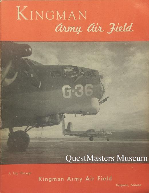 | Kingman Army Air Field Booklet, above left photo. This Kingman Army Air Field Booklet, in the QuestMasters Museum collection, was published with cooperation of the Kingman Army Air Field Public Relations Office during the war, to show the aerial gunnery training that was being done on the field during WWII. Kingman Army Air Field Decal, above right photo. This decal, in the QuestMasters Museum collection, was produced during WWII for application to a leather circle "squadron patch" for the A-2 Flying Jacket. This would have been worn on the left front of the A-2 Flying Jacket of the staff, instructors and crews that were stationed at Kingman Field, during WWII. |