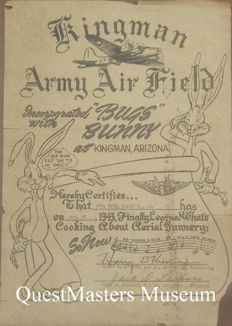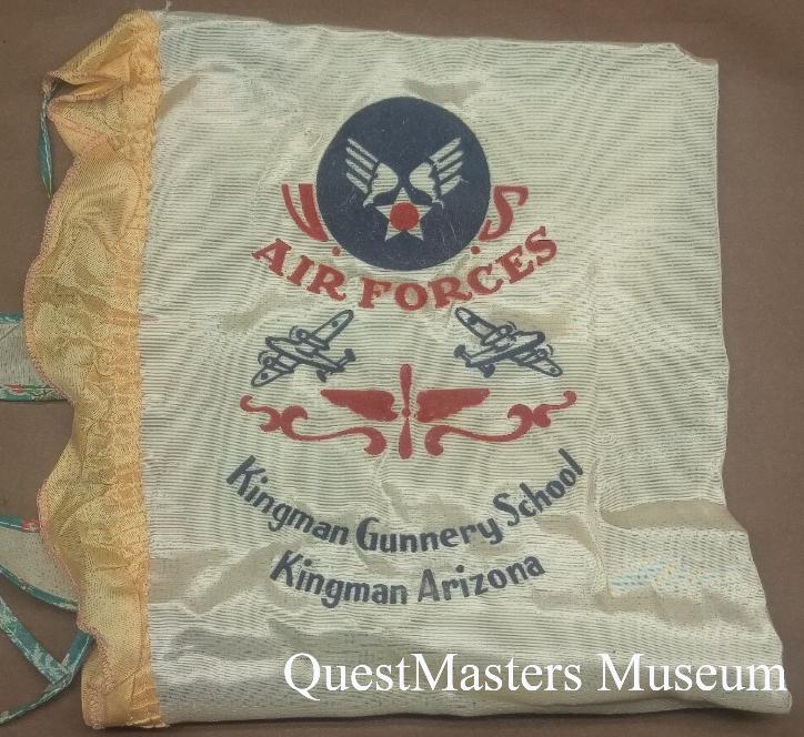 | Kingman Army Air Field Souvenir Apron, above left photo. This Kingman Army Air Field Souvenir Apron, in the QuestMasters Museum collection, was sold in the Kingman Field Post Exchange. This souvenir was produced so that a Service Member could mail-home something from their time at the Gunnery School at Kingman Field. Kingman Army Air Field Gunnery Graduation Certificate, above right photo. This certificate, in the QuestMasters Museum collection, was produced during WWII for students who completed the Aerial Gunnery School at Kingman, Arizona. This certificate was presented on October 26th 1943 by 1st Lt. Harry D. Kremer, Commanding Officer and 2nd Lt. Jack D. Ganway, Adjutant, to Sgt. James R. Ruiz Jr., ASN 39856604, Enlisted February 17th 1943 from Arizona. Sgt. James R. Ruiz Jr. would be killed in combat on March 15th 1944 as a Aerial Gunner of a B-26B "Marauder" Medium Bomber, Serial Number 42-96209, 553rd Bomb Squadron, 386th Bomb Group, Marrakech, Station 10, Morocco, North Africa. Sgt. Ruiz had been in the Army for 13 months and received his Aerial Gunners wings 6 months prior to his death. |