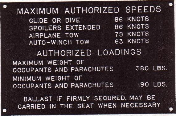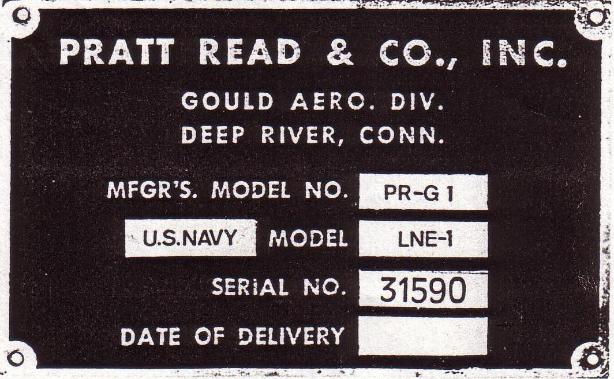 | Pratt Read & CO. data plate for LNE-1 31590, above left photo. This plate is interesting since the serial number 31590 was not assigned to the LNE-1 production contract. Maximum speed and load data plate, above right photo. |