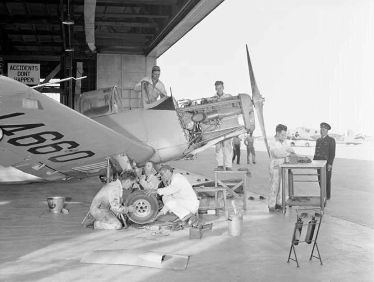 | Royal Canadian Air Force (R.C.A.F.) groundcrew servicing a Fleet Aircraft "Cornell II" S/N 14662 aircraft of No. 19 Squadron |