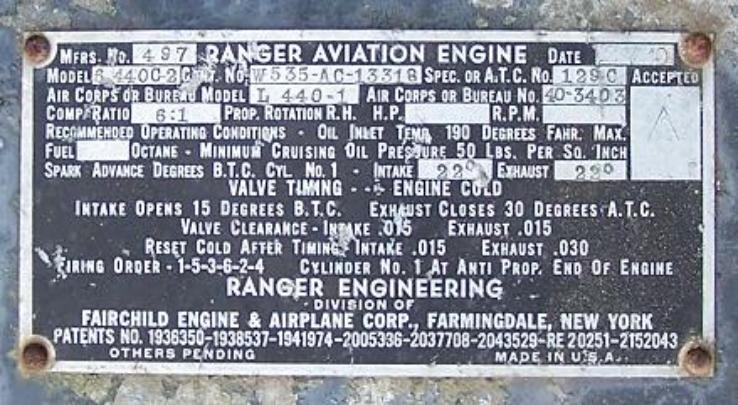 | Ranger Aviation L-440-1 engine nomenclature plate, above photo. This engine was produced and accepted on December 7th 1940, for an Army Air Corps aircraft with the serial number 40-3403. |