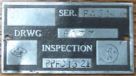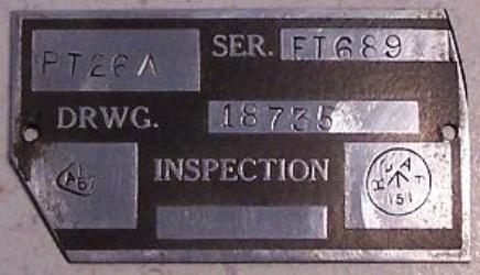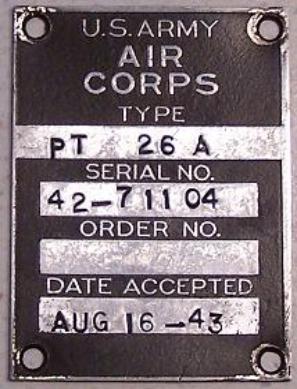 | Restored PT-26A data plates, left and above two photos. The plate to left is the A.A.F. aircraft acceptance plate. The two restored plates above, are Royal Canadian Air Force (R.C.A.F.) inspection plates. |